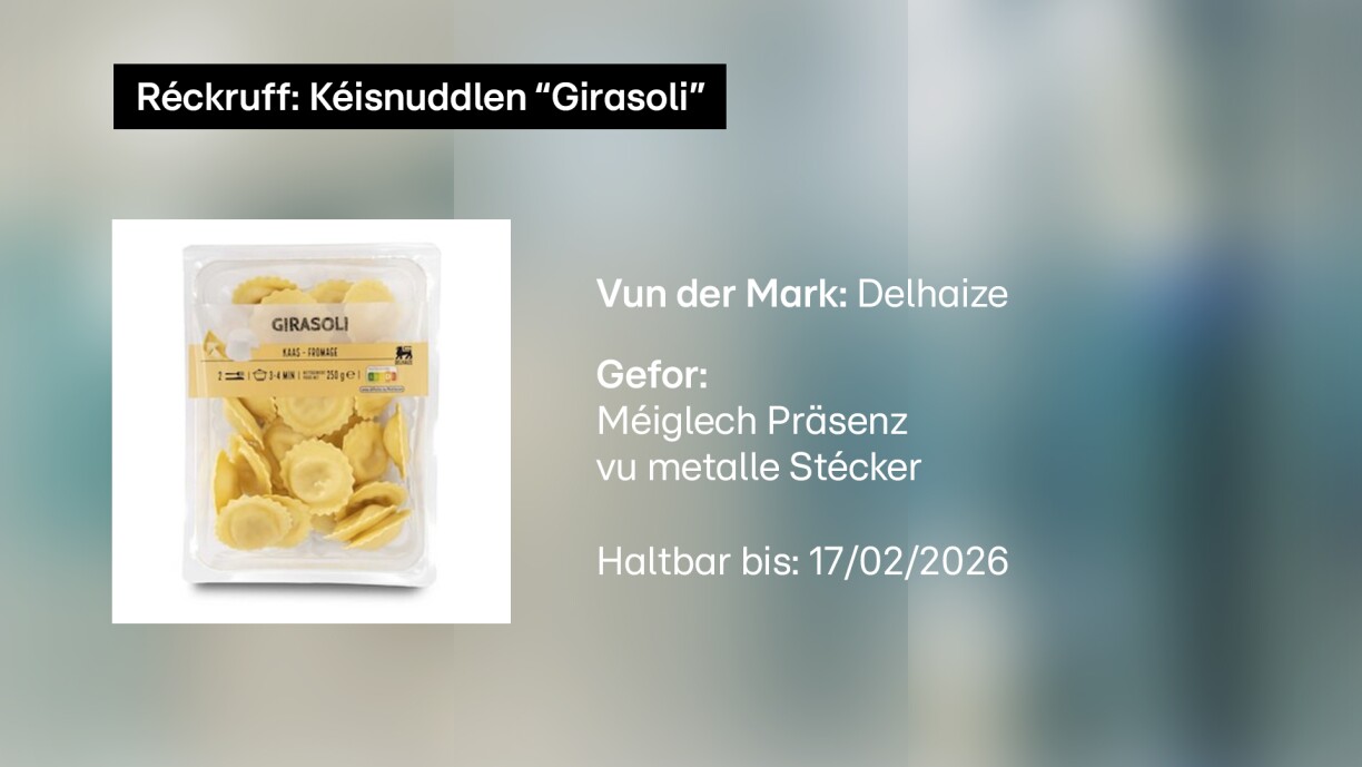 Delzhaize réit senge Konsumenten, fir d’Girasoli fromage 250g, wa si an deem Lot, dee veronrengegt kéint sinn, hiergestallt goufen, net ze consomméieren. Si sollen de Produit zeréck an de Buttek bréngen, wou si hir Suen da rembourséiert kréien.