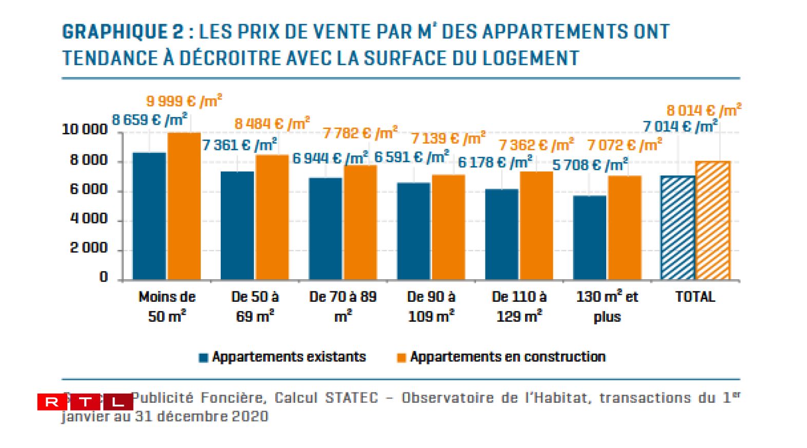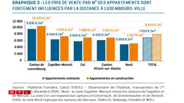 Nei Appartementer sinn duerchschnëttlech op 1 Joer gekuckt 14,4% méi deier ginn, aler souguer 15,8%. Bei den Haiser ass et eng Hausse vun 19,7% op ee Joer gekuckt. Wat d’Wunneng oder d’Haus méi no bei der Stad läit, wat de Meterkaree-Präis méi héich ass.