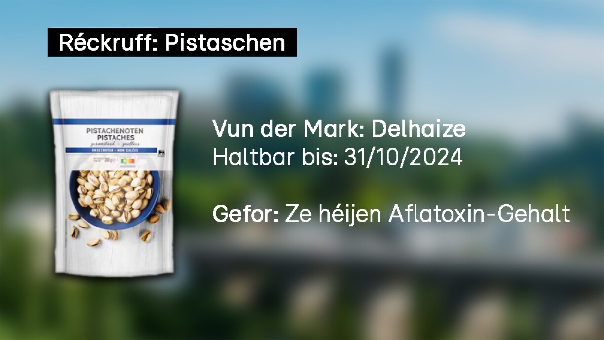 Et handelt sech ëm de Produit “200G DLL Pistaches”, deen tëscht dem 7. Februar an dem 15. Mäerz dëst Joer verkaf gouf. Bei rezente Kontrolle wier en ze héije Gehalt vum sougenannten Aflatoxin an de Pistasche festgestallt ginn.