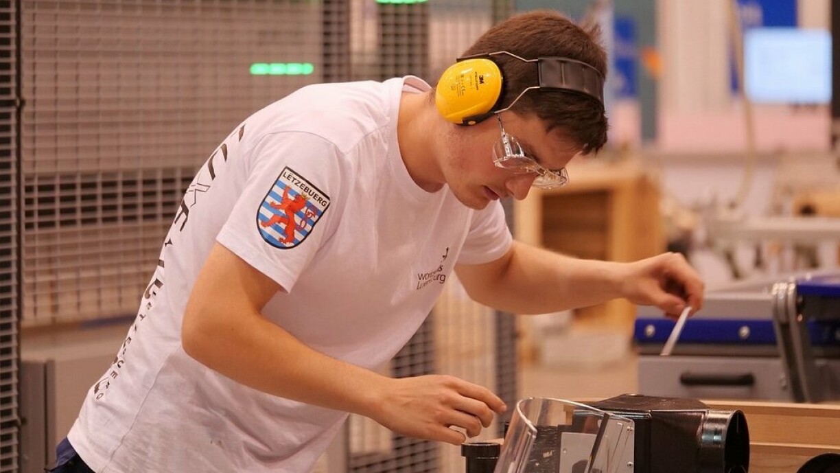 Ee Member vun der Lëtzebuerger Nationalekipp ass de Mathieu Klein. De Schräiner trëtt am Skill “Joinery” géint 11 aner Jonker un. En Deel vum Holz gouf schonn ersat, bei der Kontroll huet et de strenge Krittäre vun den Experten net standgehalen. Elo hoffe si an d’Participanten, datt si endlech kënne lassleeën.
