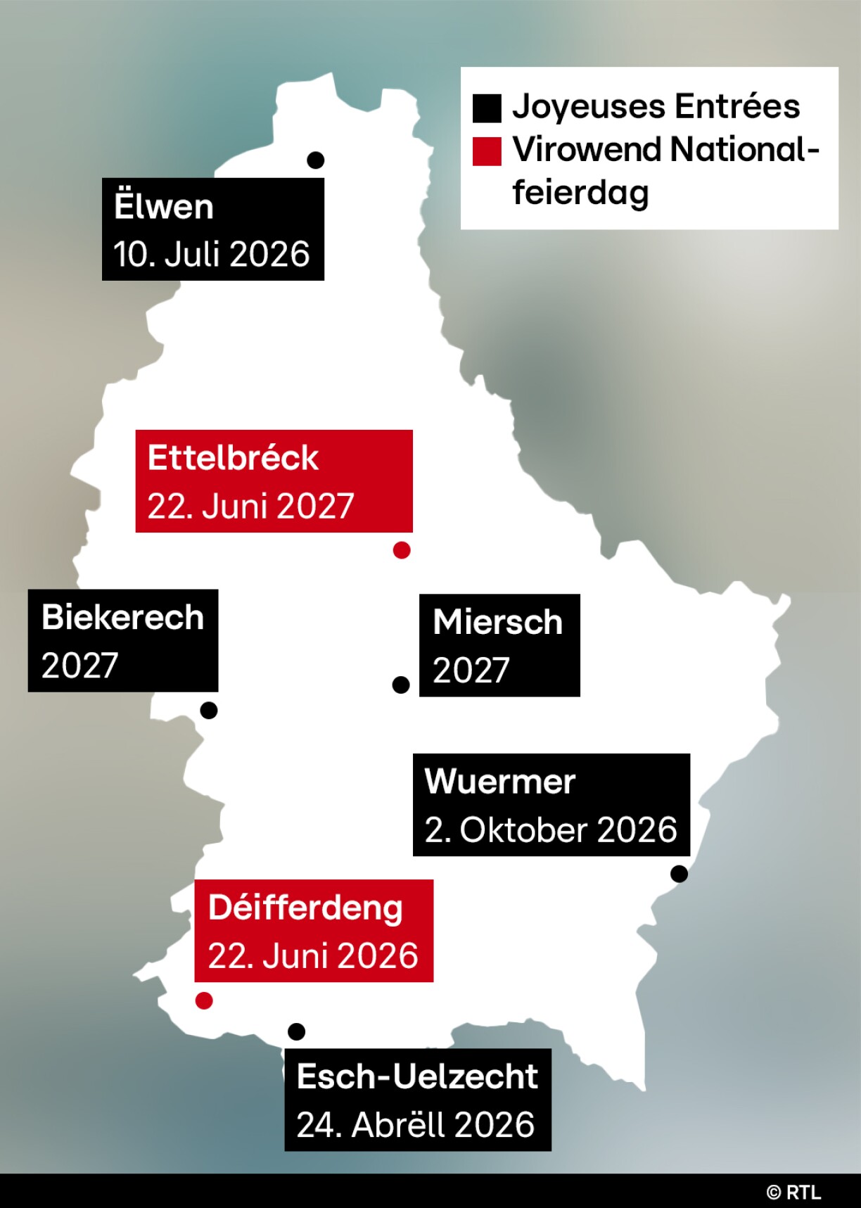 Am Kader vun Nationalfeierdag wäert déi groussherzoglech Koppel dëst Joer iwwregens um Virowend Déifferdeng besichen an d’nächst Joer Ettelbréck, ier et owes nees traditionell fir de Fakelzuch an d’Stad geet.