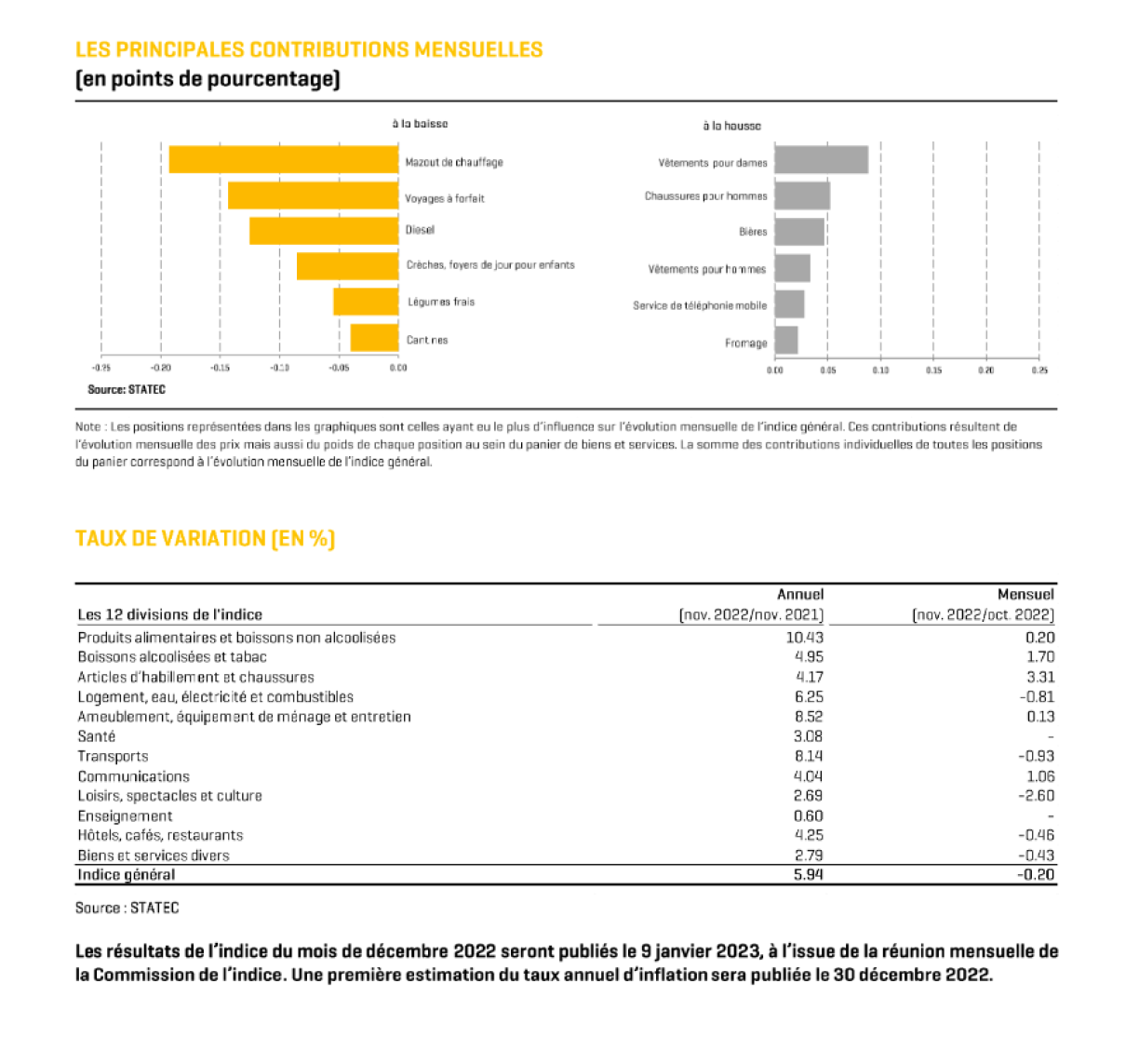 E Mëttwoch de Moien huet de Statec d’Konjunktur-Nott fir de Mount November publizéiert. Op d’Joer gekuckt geet den Inflatiouns-Taux vu 6,9 op 5,9% substantiell erof. Eleng fir de leschte Mount gouf eng Baisse vun 0,2% notéiert par Rapport vum Oktober. Ursaache waren d’Präisser op de Pompelen a fir Reesen, déi erofgaange sinn.