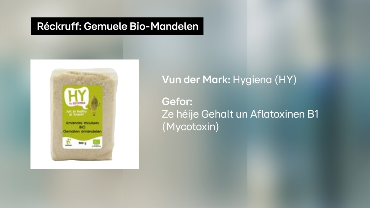 Betraff sinn déi gemuele Bio-Mandele vun der Mark “Hygiena (HY)” am Pak vun 250 a 500 Gramm mat de Mindesthaltbarkeetsdatumer vum 13. , 15. an 22. September, vum 18. Oktober a vum 7. November 2026 mat de Produitsnummeren 25021957, 26000081, 25022441 an 25021389.