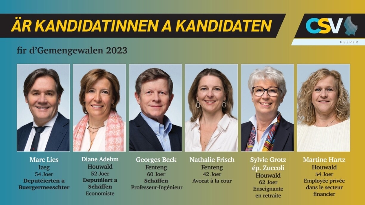 D’CSV Hesper huet déi 17 Kandidate fir d’Gemengewale lancéiert. Spëtzekandidat ass den Député-Maire Marc Lies. Och op der Lëscht sinn d’Schäffin an Deputéiert Diane Adehm souwéi de Schäffe Georges Beck an d’Gemengeréit Robert Leven, Jean Theis, Guy Wester an Anne Huberty. De Véiertgewielte vun 2017 an aktuelle Schäffen, Romain Juncker, geet iwwerdeems dëst Joer net méi zu Hesper mat an d’Walen. Par Rapport zu de leschte Walen klëmmt d’Zuel vun de Conseilleren dëst Joer vu 15 op 17, dat well d’Awunnerzuel geklommen ass. D’Lëscht huet 9 Fraen an 8 Männer. Den Altersduerchschnëtt läit bei 48 Joer.