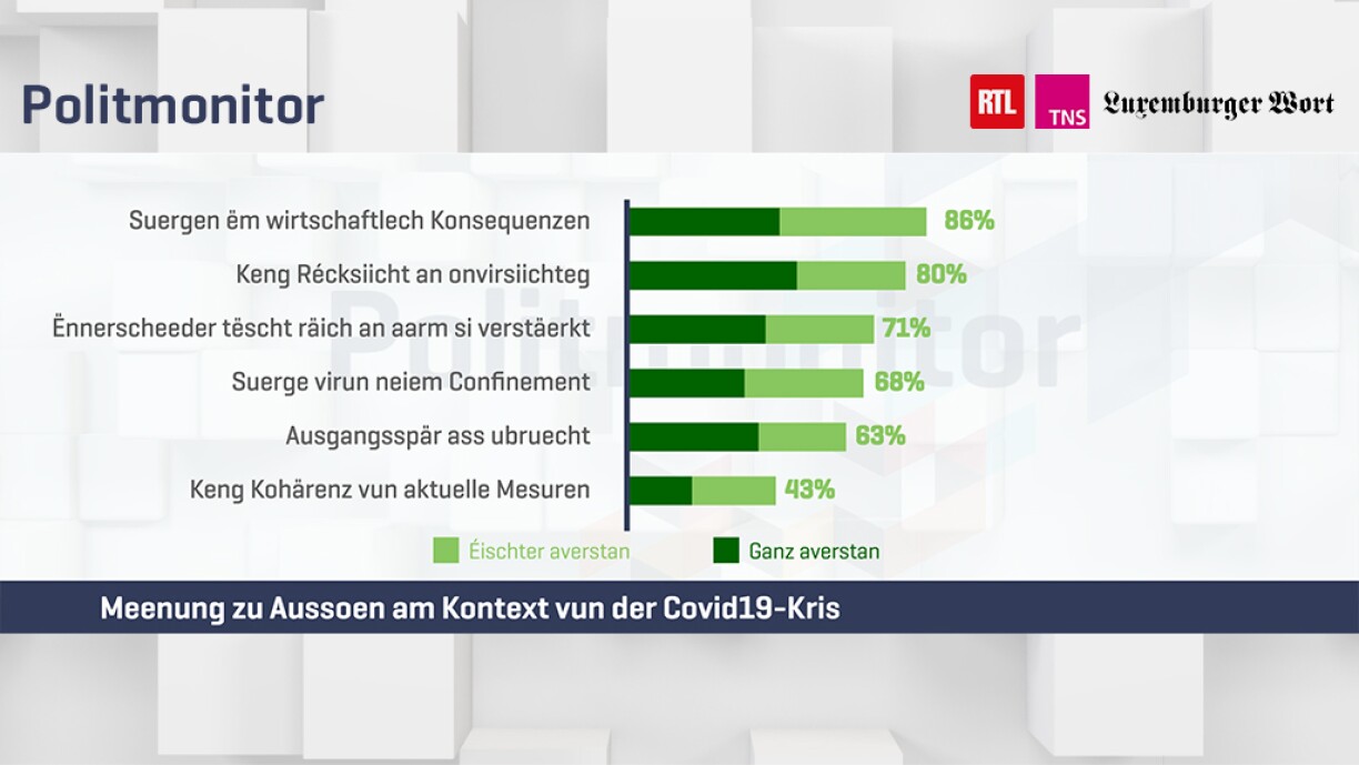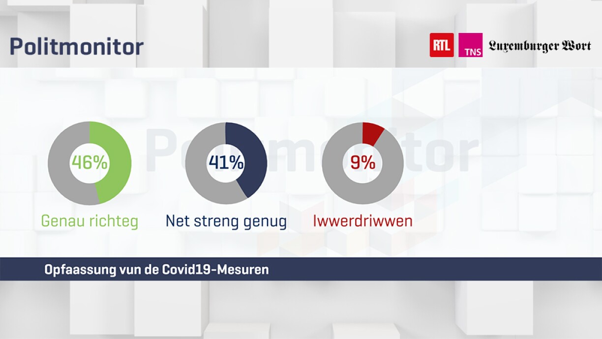 “81% vun de Wieler sinn der Meenung, datt d’Limitatioun op 4 Leit der Situatioun ugepasst ass. Beim Couvre-Feu sinn et 63%.”