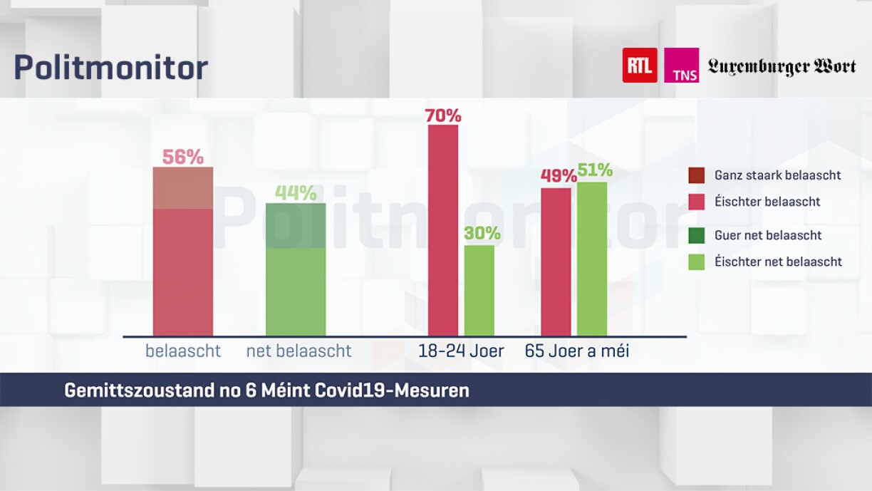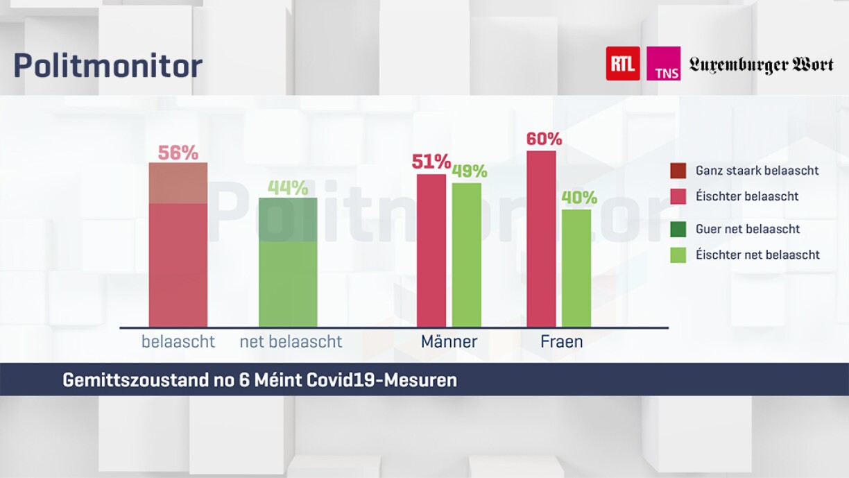 “56% vun de Leit fille sech duerch d’Situatioun belaascht. Frae méi ewéi Männer. Virun allem déi Jonk tëscht 18 a 24 Joer fille sech belaascht mat 70%. Déi eeler Generatioun fillt sech am mannste belaascht.”