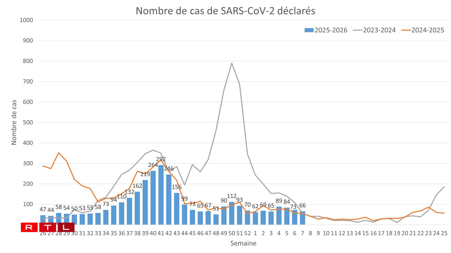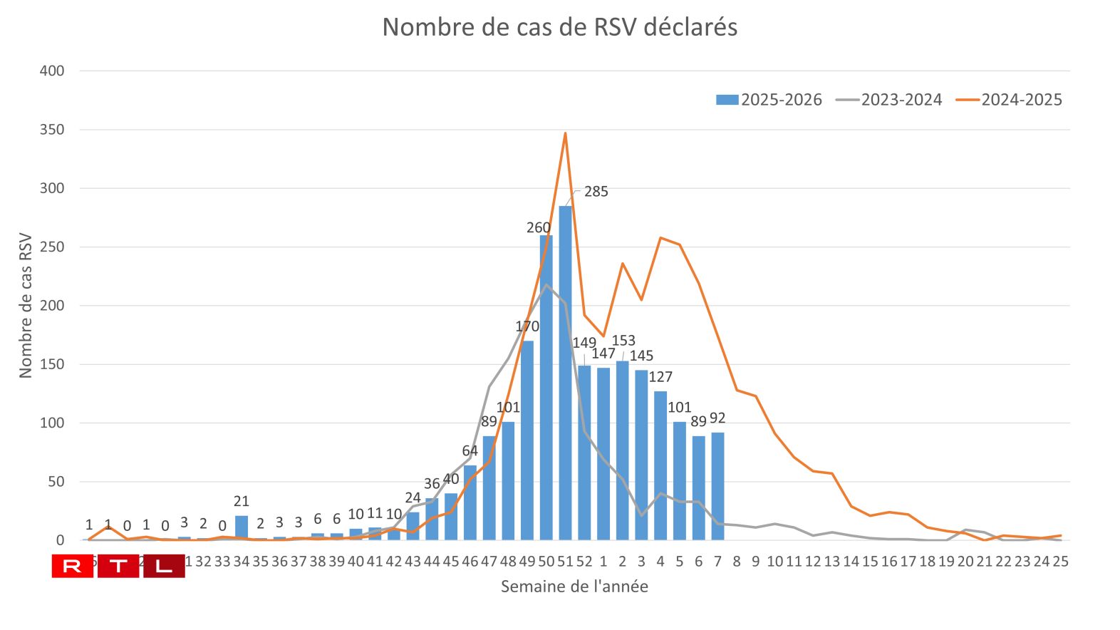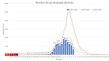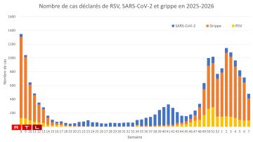 D’Grippeninfektioune sinn an dëser Woch ëm 42 Prozent erofgaangen, nämlech vu 555 op 321 Fäll. Beim RS-Virus gouf et allerdéngs eng liicht Hausse vun 3 Prozent am Verglach mat der leschter Woch. Dat huet d’Santé an engem Communiqué matgedeelt. Deemno ginn et den Ament hei am Land 92 RSV-Infektiounen.