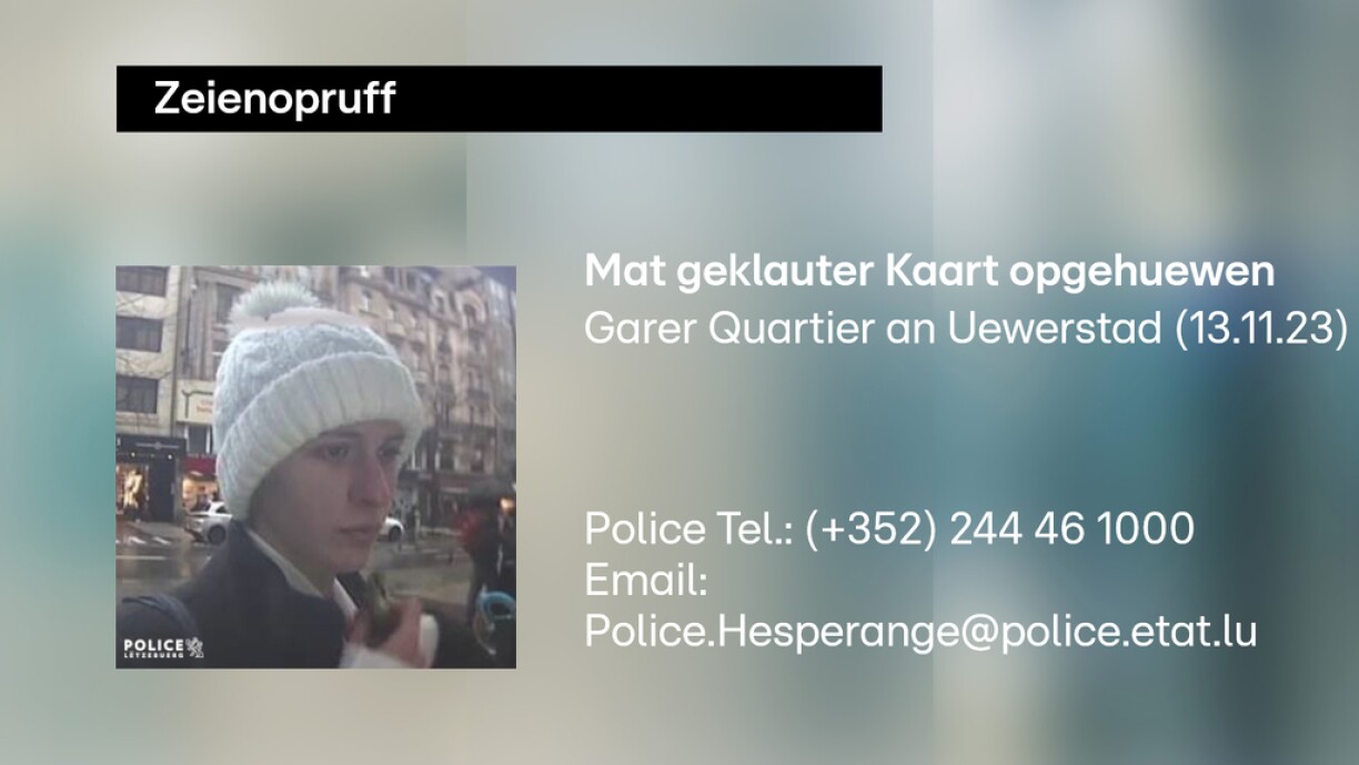Wéi d’Police matdeelt, ginn d’Faiten op den 13. November zejoert zeréck. D’Fra op der Foto gëtt verdächtegt, op dësem Dag op Bankomaten am Garer Quartier an an der Uewerstad mat enger geklauter Kreditkaart Suen opgehuewen ze hunn.