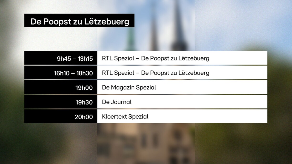 Ma och wann Dir net um Fluchhafen, beim Palais, virum Cercle oder an der Kathedral derbäi sidd, op RTL kënnt Dir all Moment vum Poopstbesuch live suivéieren.