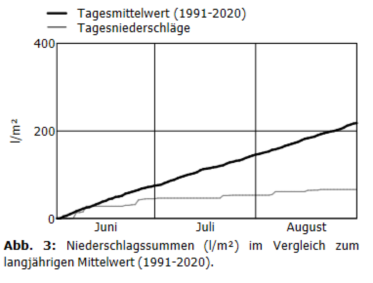 Et huet an de leschte Méint mat 74 Liter op de Metercarré ganzer 66% manner gereent wéi an der Referenzperiod vun 1991 bis 2020. Domat war de Summer 2022 den dréchensten zanter 1947. Besonnesch am Juli huet de Ree batter gefeelt. Do si grad mol 6,8 Liter de Metercarré erofkomm, wat carrement méi wéi 90% manner ass par rapport zu der Laangzäitmoyenne. Am mannsten Nidderschlag gouf am Joer 1949 gemooss mat nëmmen 2,2 l/m².