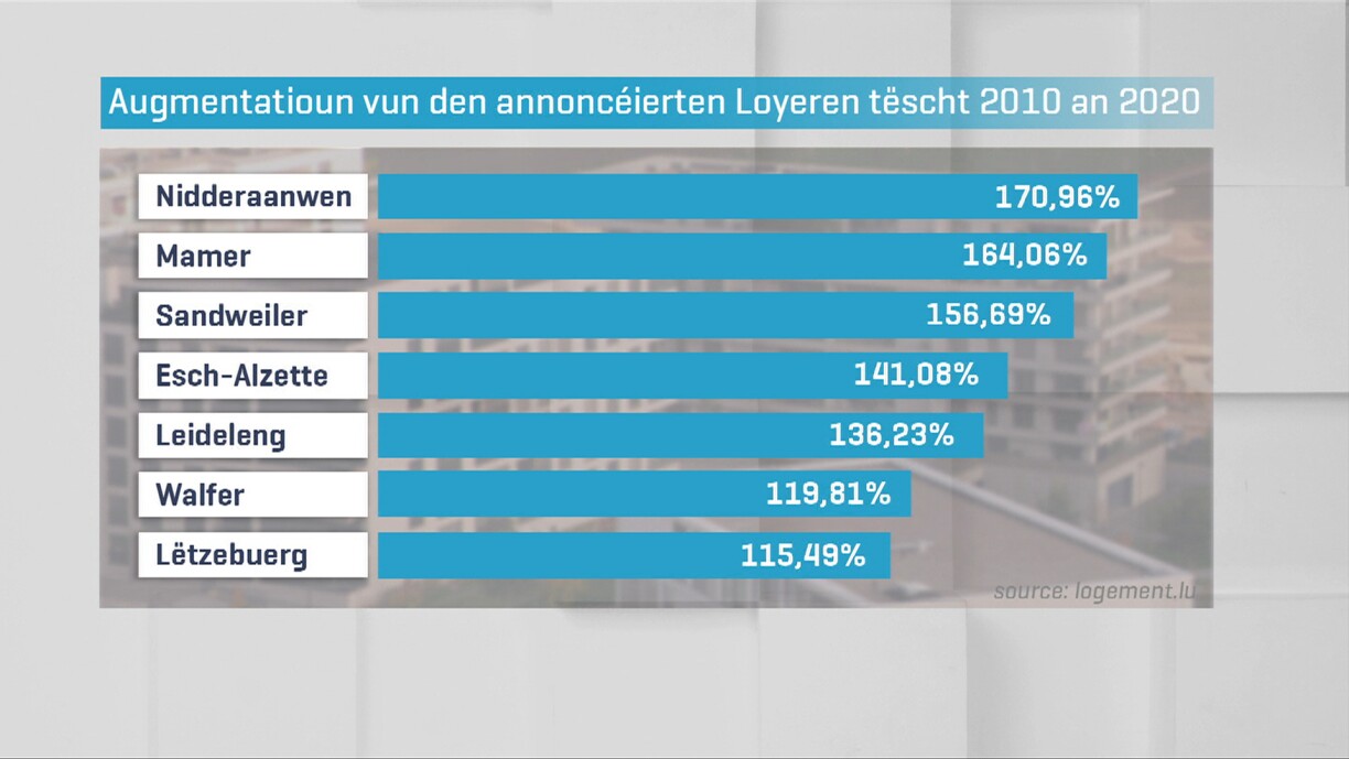 Den Observatoire de l’habitat erméiglecht en Iwwerbléck ze kréien iwwert d’Entwécklung vun de gefrote Loyeren. D’Hausse vun den annoncéierte Loyeren tëscht dem 3. Trimester 2021 an dem 3. Trimester 2022 läit bei +4,7%. D’Entwécklunge variéieren och tëscht de Gemengen. Zum Beispill ass den annoncéierte Loyer an der Gemeng Nidderaanwen bannent 10 Joer ëm 170% an d’Luucht gaangen.