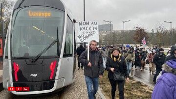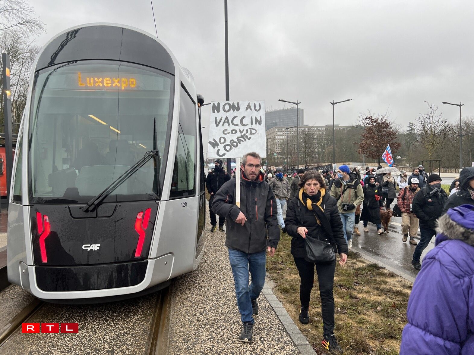 Den Tram konnt ufanks trotz der Manifestatioun normal zirkuléieren, den Trafic dogéint dierf awer net iwwert duerch de Rondpoint Schuman an iwwert d’Rout Bréck fueren. De Cortège gëtt vu Policecamionnetten encadréiert.