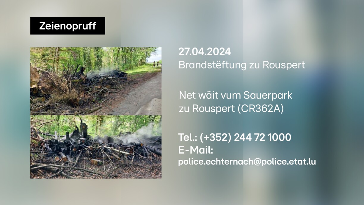 All Informatioune si fir d’Police vun Iechternach, dëst via Telefon um (+352) 244 72 1000 oder via E-Mail op police.echternach@police.etat.lu.