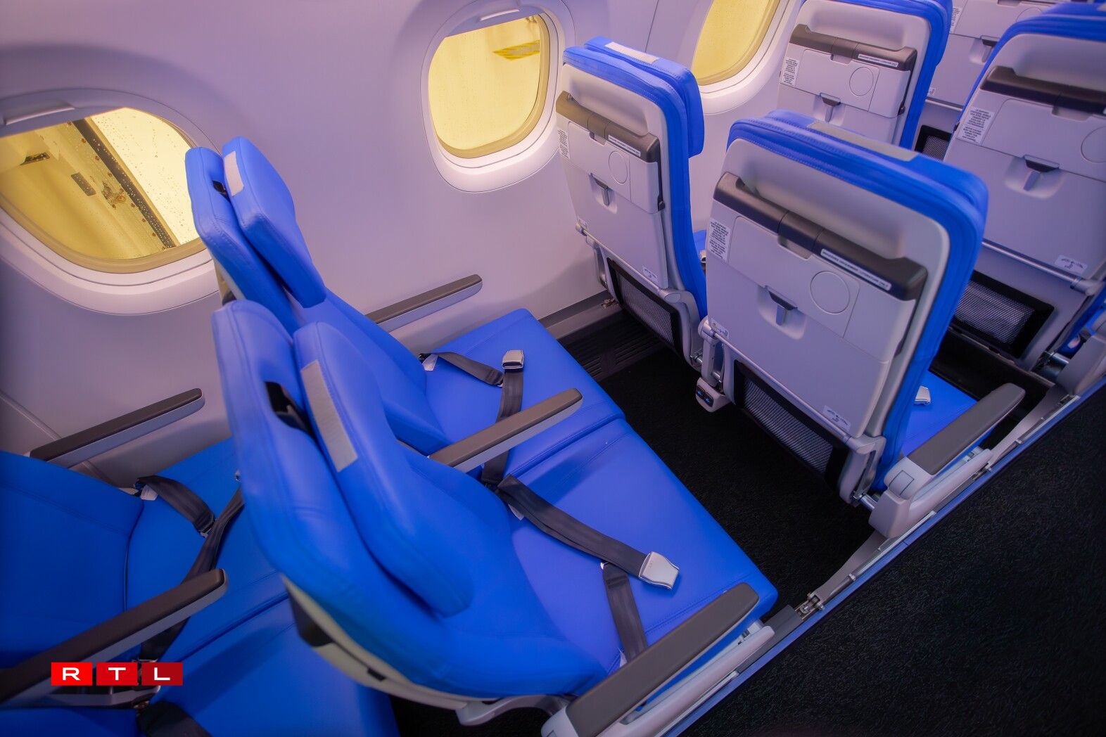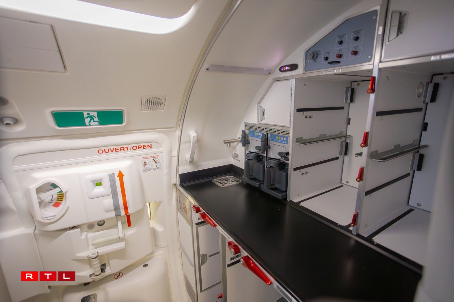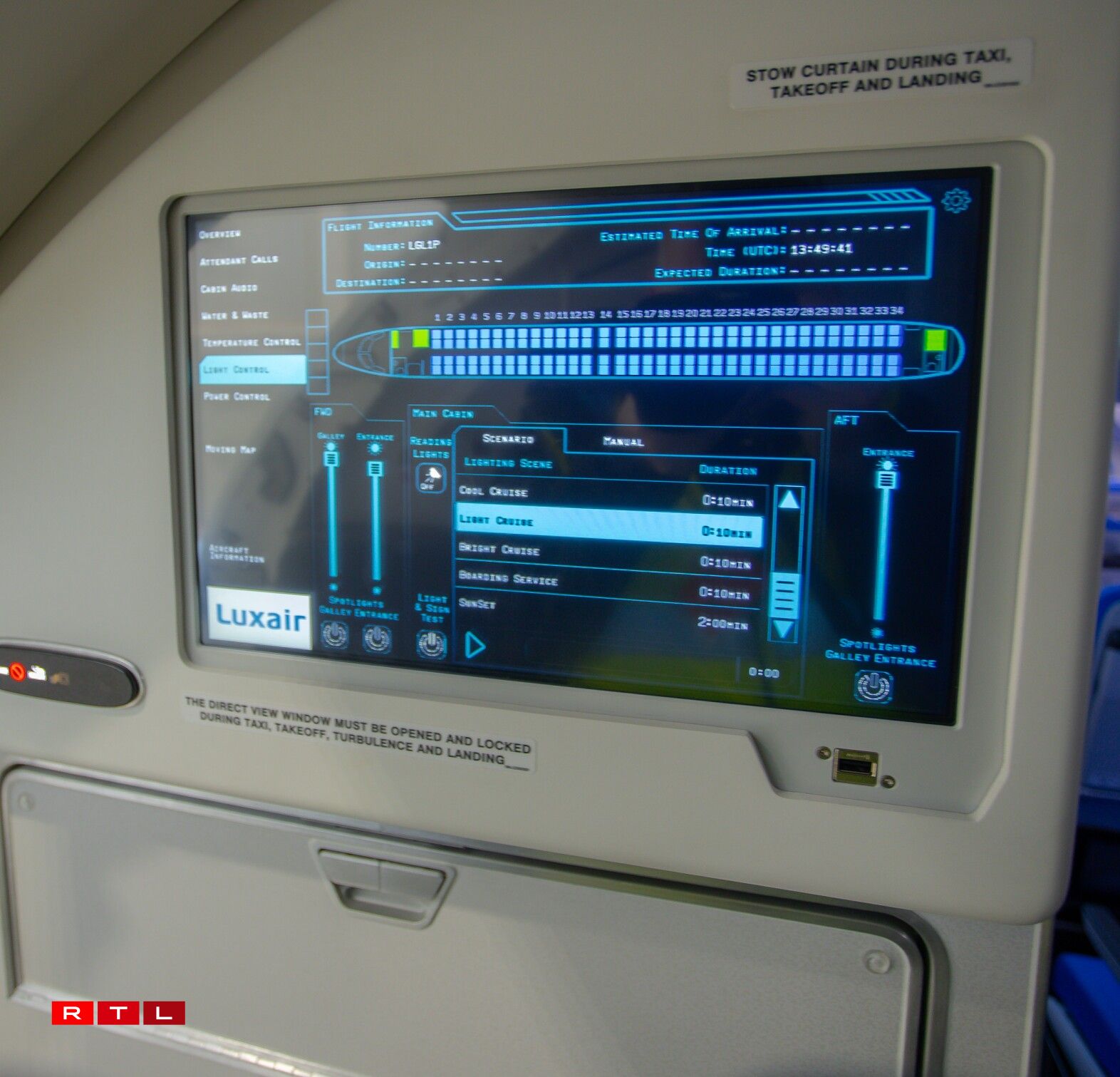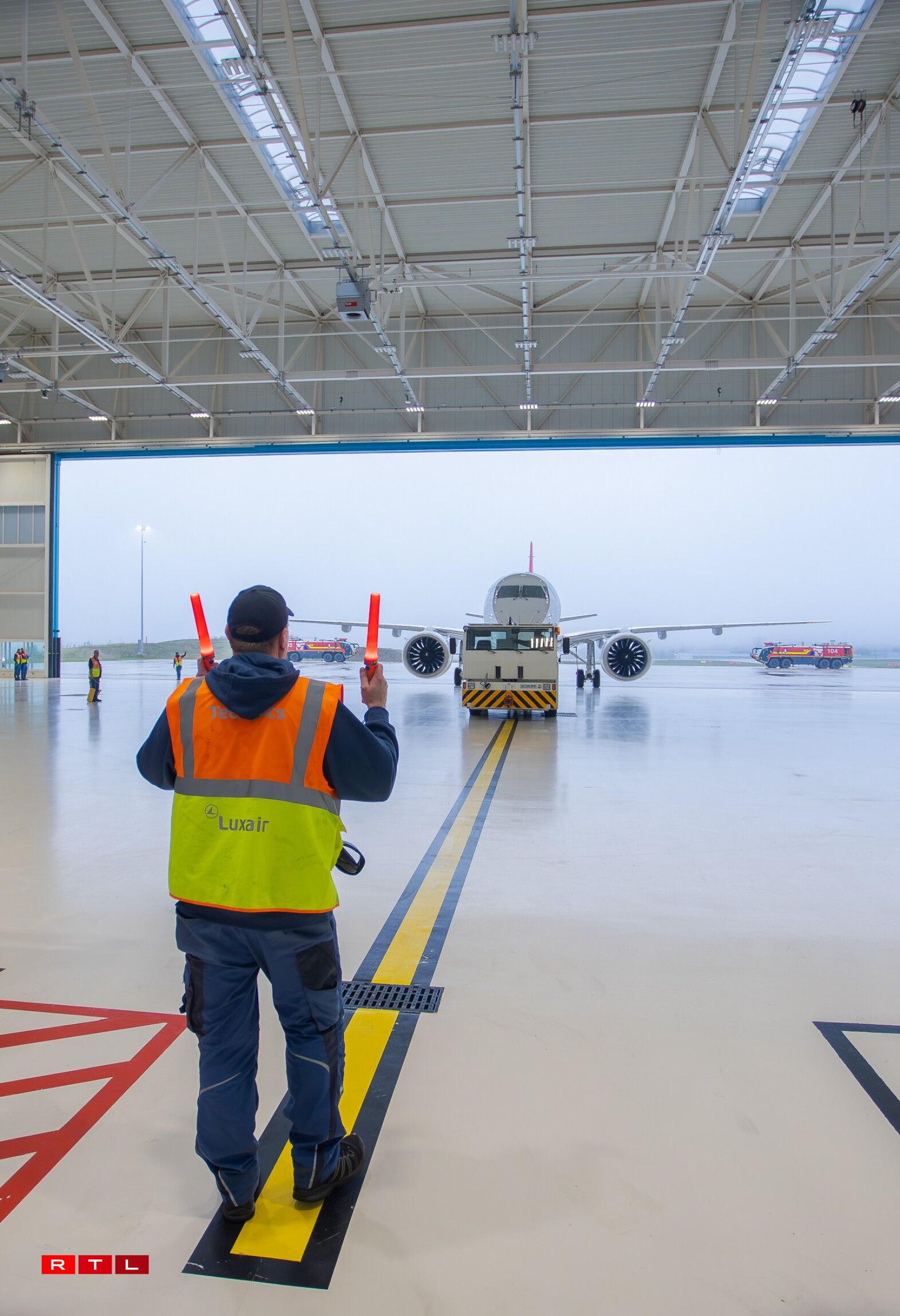 15.000 Nitten an 90 Kilometer Kabel si verschafft ginn um 35 Tonne schwéiere Koloss. An anescht, wéi mol bei aneren Hiersteller, géing de Fliger hei fir d‘éischt vu bausse lackéiert ginn. Souwuel baussen, wou een elo déi genee selwecht Faarwen, wéi déi vum Lëtzebuerger Fändel hätt, wéi och bannen, wier et der Luxair wichteg, hir nei Identitéit ze weisen, déi sech nach méi mat hirer Lëtzebuerger DNA ervirhieft. An déi dem Client och bannen de gréisstméigleche Confort bitt.