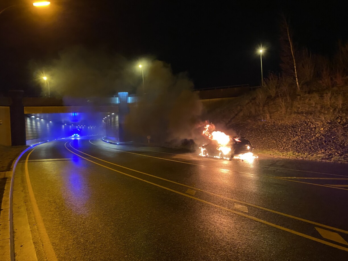 Méi spéit, kuerz viru 4 Auer, stoung tëscht Gonnereng a Jonglënster, um Ufank vum Contournement nach en Auto a Flamen. De Chauffer hat wärend der Faart am Beräich vun der Konsol vu sengem Auto e Feier bemierkt an ass stoe bliwwen. Direkt huet hien och d’Rettungsekippe geruff. D’Pompjeeë vu Lënster waren dunn op der Plaz, fir ze läschen. Zeienaussoen no soll et sech heibäi ëm en Elektroauto gehandelt hunn. Dat krut RTL op Nofro hin och confirméiert. Bei all de Bränn ass kengem eppes geschitt.