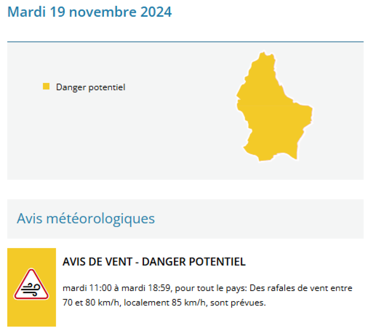 Wéi Meteolux schreift, ass mat Wandvitesse vu 70 bis 80 Stonnekilometer ze rechnen, lokal sinn awer och mol bis zu 85 km/h méiglech. Bei der Temperatur leie mer tëscht 8 an 10 Grad, deemno dierft ee vun engem éischter ongemittlechen Dag schwätzen, deen eis erwaart.