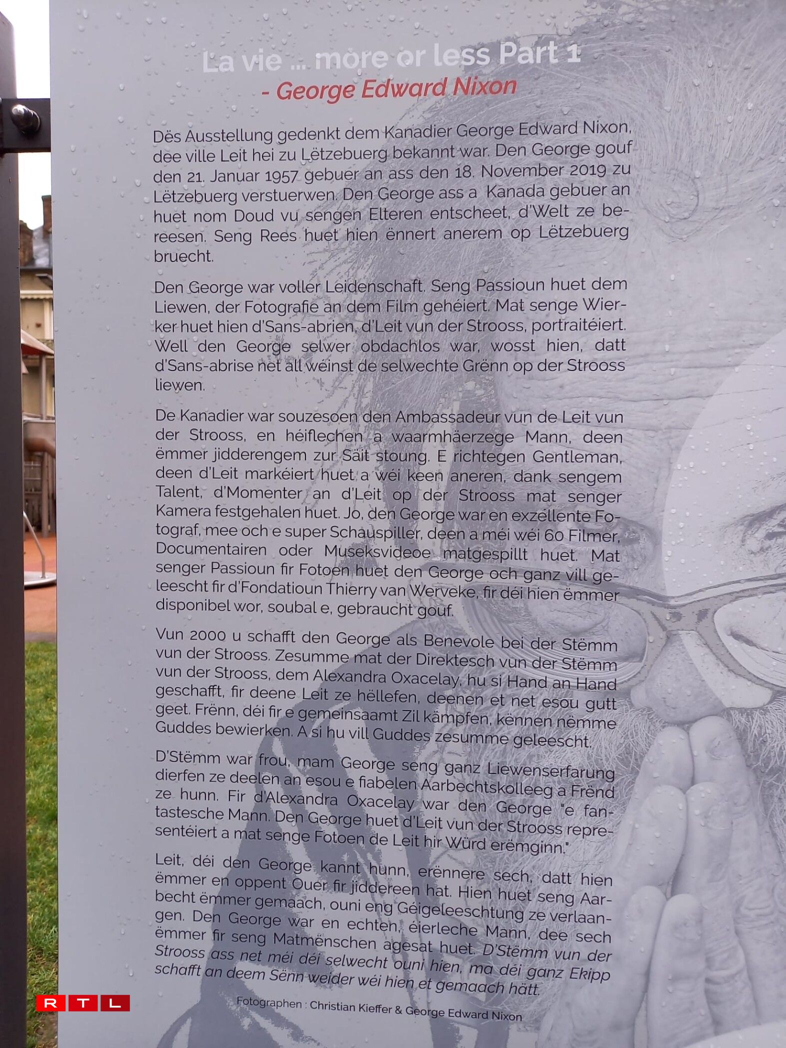 Virun zwee Joer ass den George Edward Nixon verstuerwen. Seng Biller wéilt een awer net an en Tirang stiechen, mee mat de Leit deelen. Genee dowéinst huet ee sech dofir entscheet, seng Fotoen op der Stroossbuerger Plaz auszestellen.