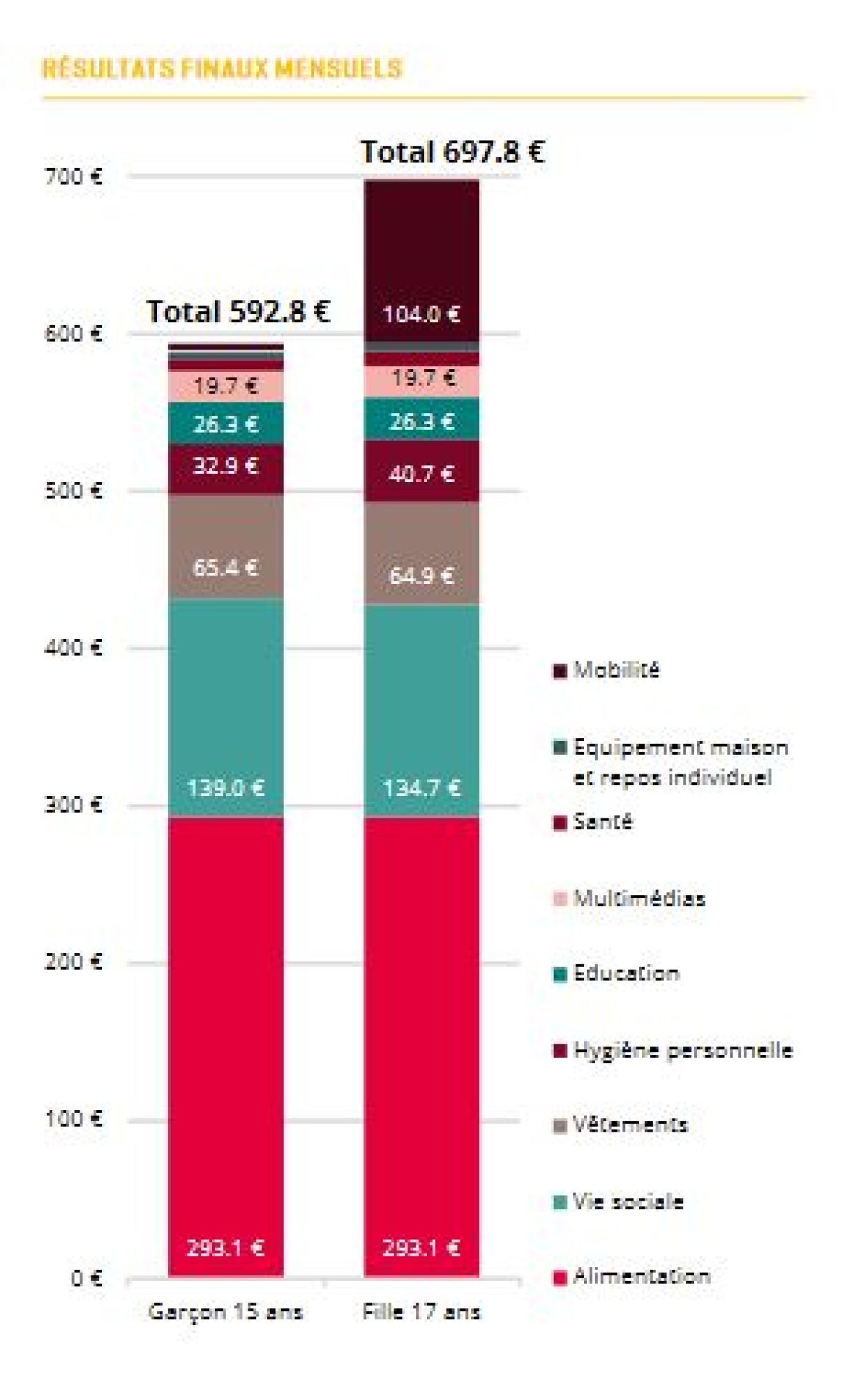 An deem Budget sinn net déi gemeinsam Käschte vum Stot matagerechent wéi de Loyer zum Beispill. Mä et geet ëm Iessen, Kleeder, Fräizäit, Schoul, Multimedia a Mobilitéit.