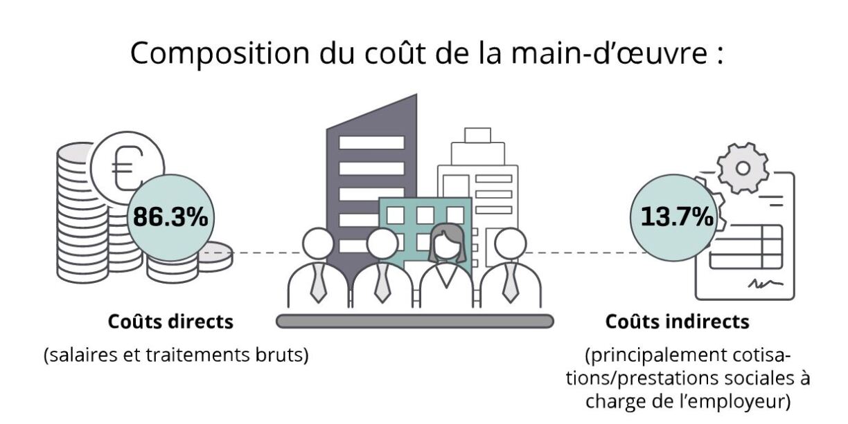 Gutt 86 Prozent vun de Käschte fir Main-d’oeuvre bestinn aus dem Salaire. Knapps 14 aus de soziale Cotisatiounen, déi den Employeur bezilt. Lëtzebuerg gehéiert zu deene Länner an der EU, an deenen eng Stonn Aarbecht am meeschte kascht.