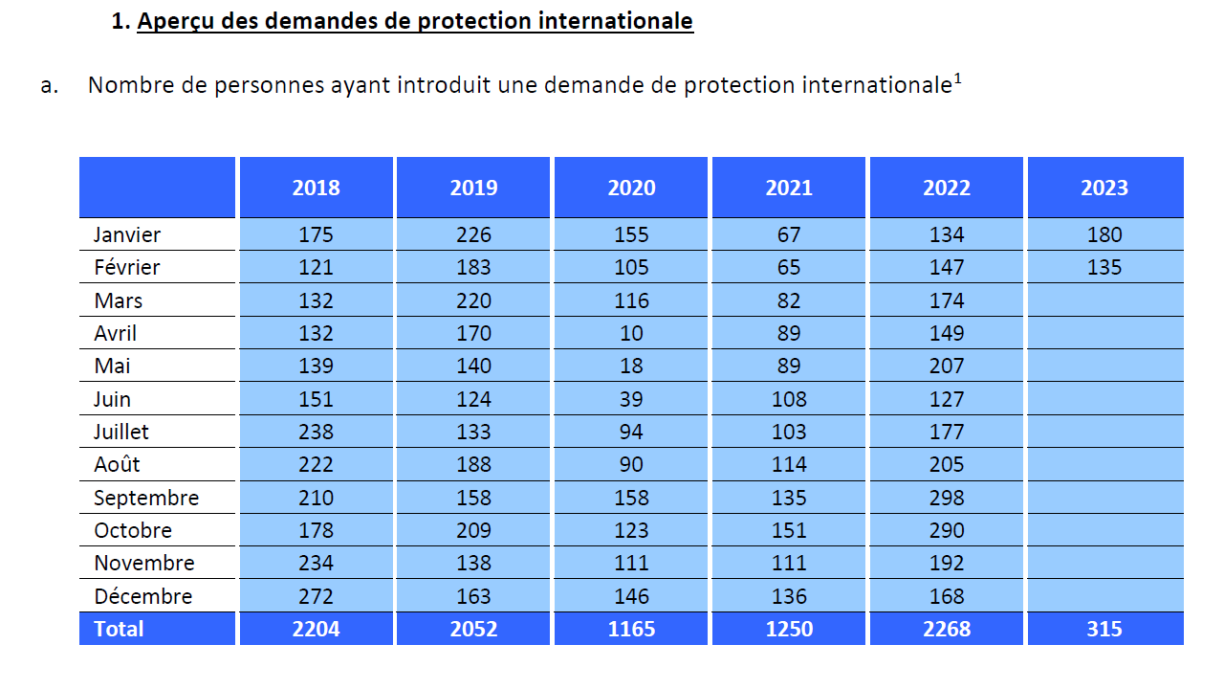 Am Februar hunn 223 Mënschen eng Schutzmesure zu Lëtzebuerg gefrot, dorënner 88 aus der Ukrain, déi eng temporär Protektioun gefrot hunn. Dat waren der 20 Prozent manner wéi de Mount virdrun. 425 Persounen aus der Ukrain hunn dann nach eng Verlängerung vun hirem Schutz gefrot. D’Demandeure vun enger internationaler Protektioun koumen aus Syrien, Eritrea, Afghanistan a Kolumbien.