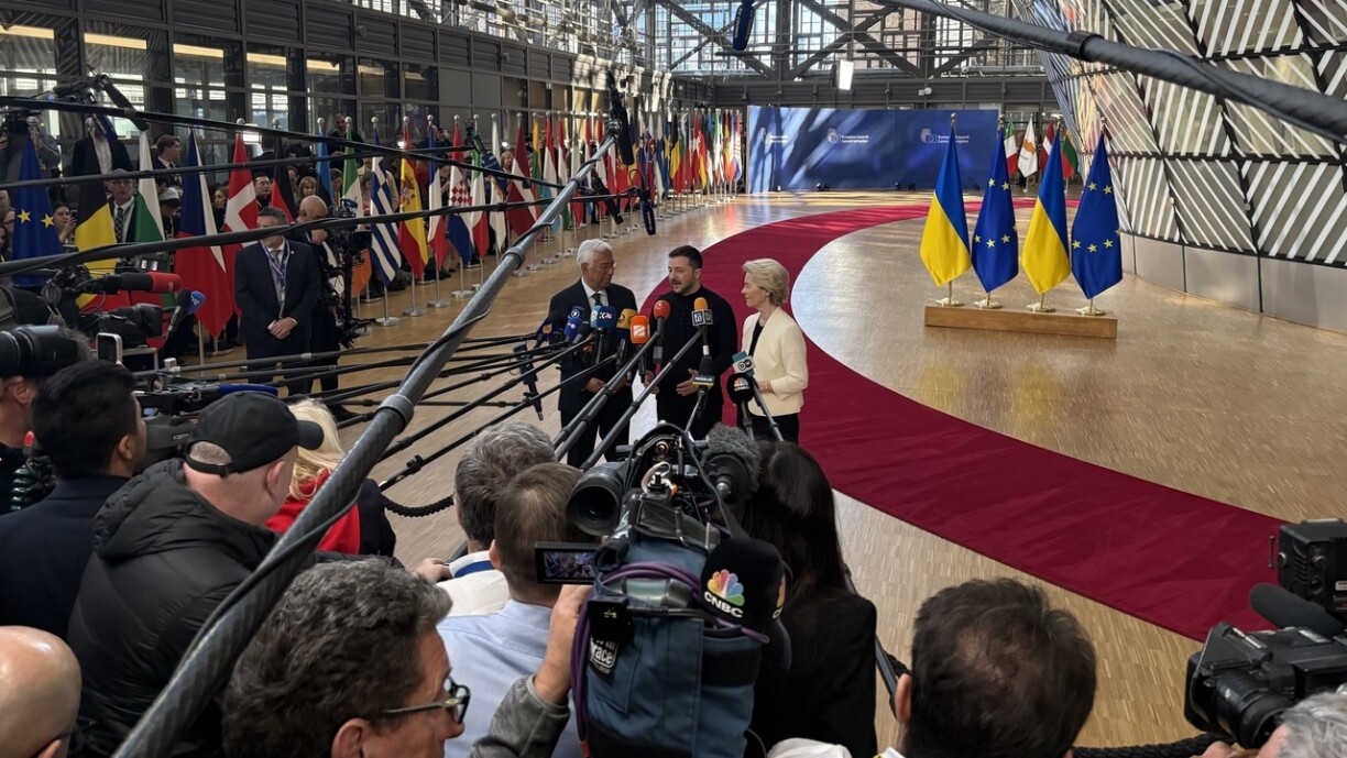 D’EU-Kommissiounspresidentin von der Leyen an de Conseilspresident Costa sinn zesumme mam ukrainesche President Selenskyj virun de Kamerae stoebliwwen an hunn hien als “Familljemember” vun Europa bezeechent. De Selenskyj selwer sot, e puer Mol “Merci”. D’Hëllef vun der EU wier e Signal, datt all Ukrainer géing spieren. De Plang, fir d’EU opzerëschten, wier a sengen Aen och eng “ganz gutt Decisioun”.