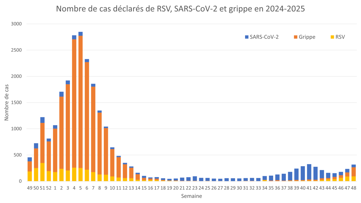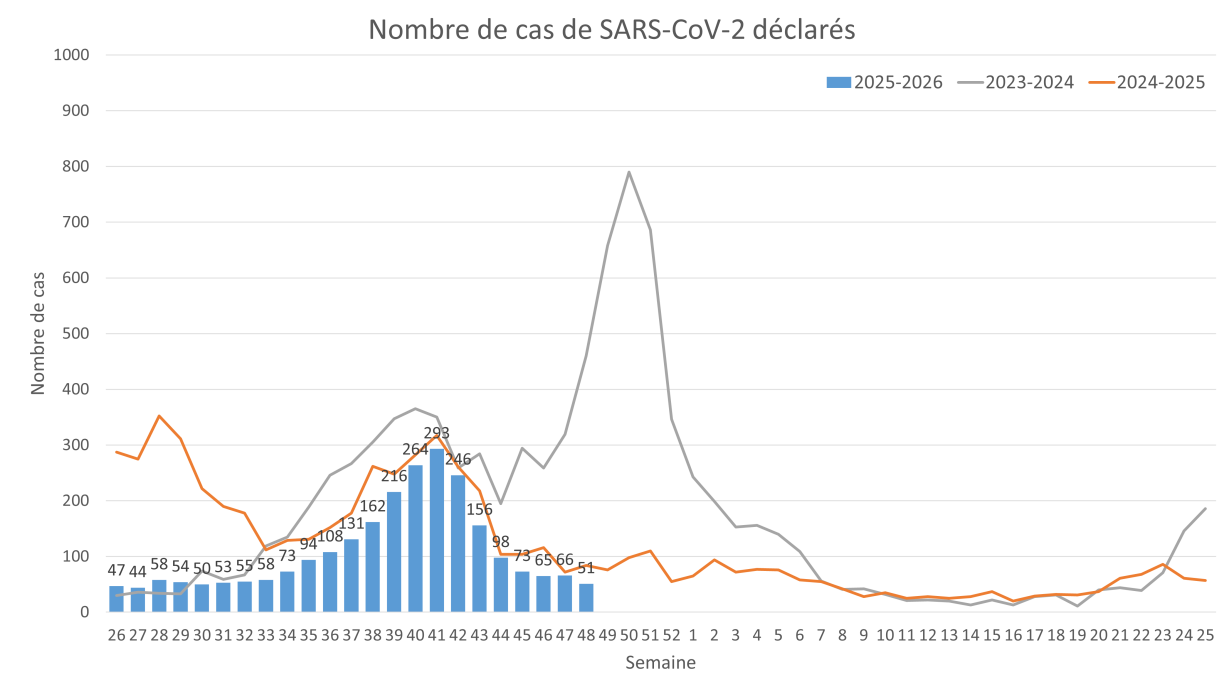 Am Laf vun der 48. Woch vum Joer, tëscht dem 24. an dem 30. November 2025, ass d’Zuel vun de gemellte SARS-CoV-2-Infektioune staark ëm ronn 23% gefall, dat vu 66 op 57 Fäll.