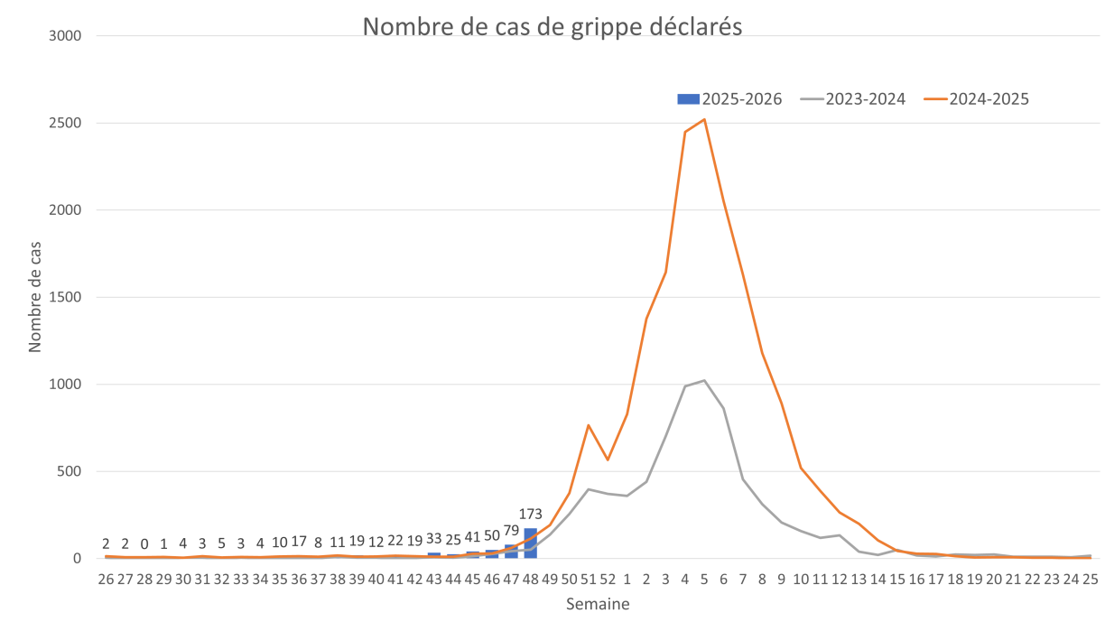 D’Zuel vun de Fäll, déi am selwechten Zäitraum vun de Laboratoiren deklaréiert gi sinn, ass staark geklommen, dat vun 79 op 173 geklommen, also eng Hausse vun 119%. An der leschter Woch ware et 98% vun de Fäll d’Gripp vum Typ A an 2% vum Typ B.