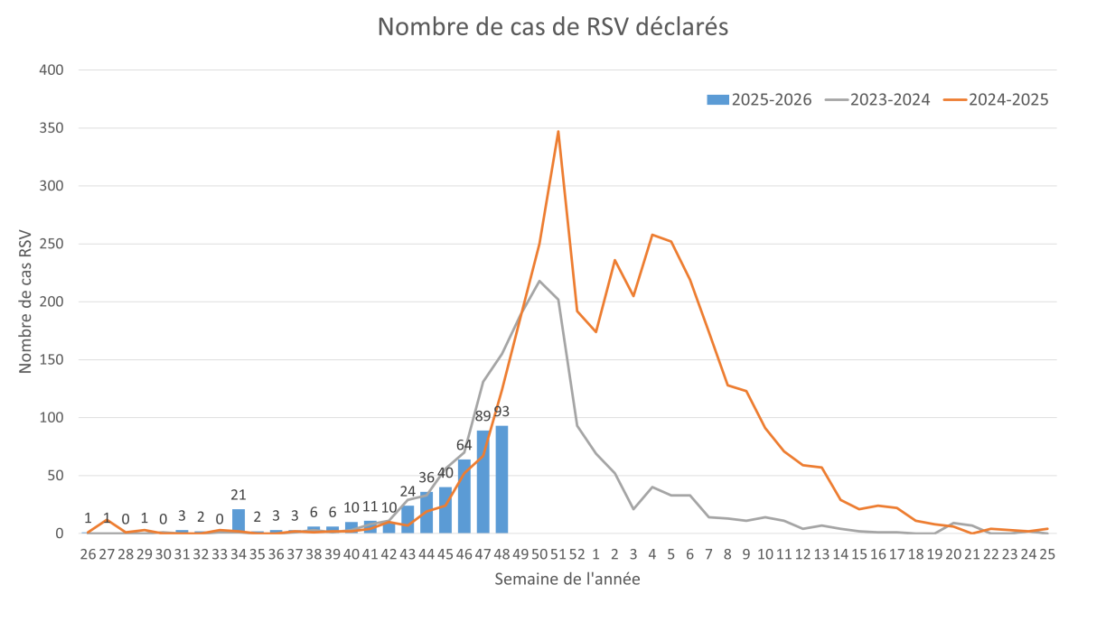 Hei ass eng liicht Hausse vu 4% ze konstatéieren, mat 93 confirméierte Fäll géintiwwer 89 an der Woch virdrun. Zënter Oktober 2025 fale 75% vun den Infektiounen hei op Kanner ënner 9 Joer, wat weise géif, dass virun allem jonk Persoune de Virus kréien.
