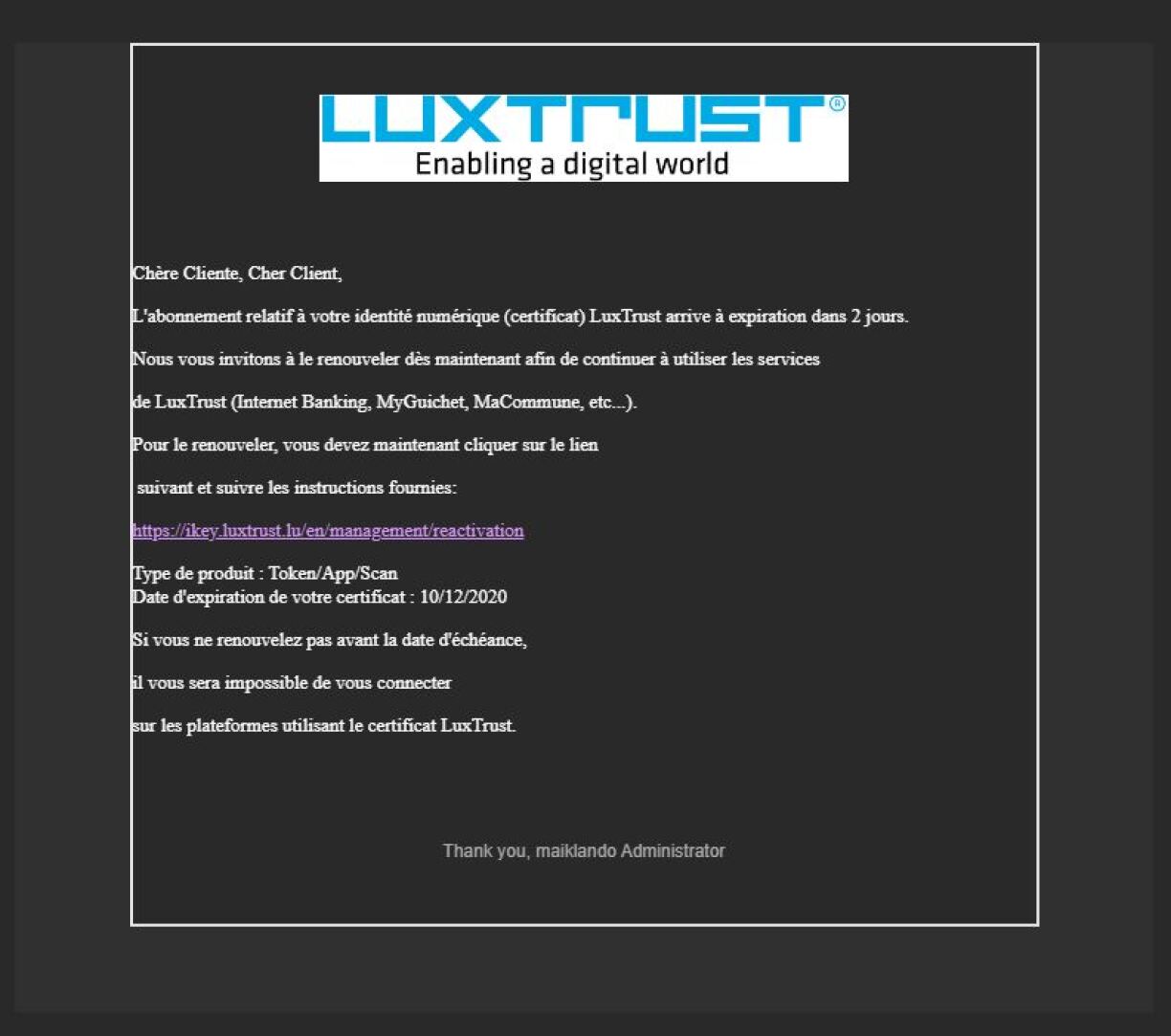 Bei esou Maile soll een evitéieren, fir op de Link ze klicken. Luxtrust selwer warnt op hirem Internetsite virun esou Mailen a gëtt am Fall vun engem Doute un, si per Telefon op +352 24 550 550 oder per Mail op questions@luxtrust.lu ze kontaktéieren.