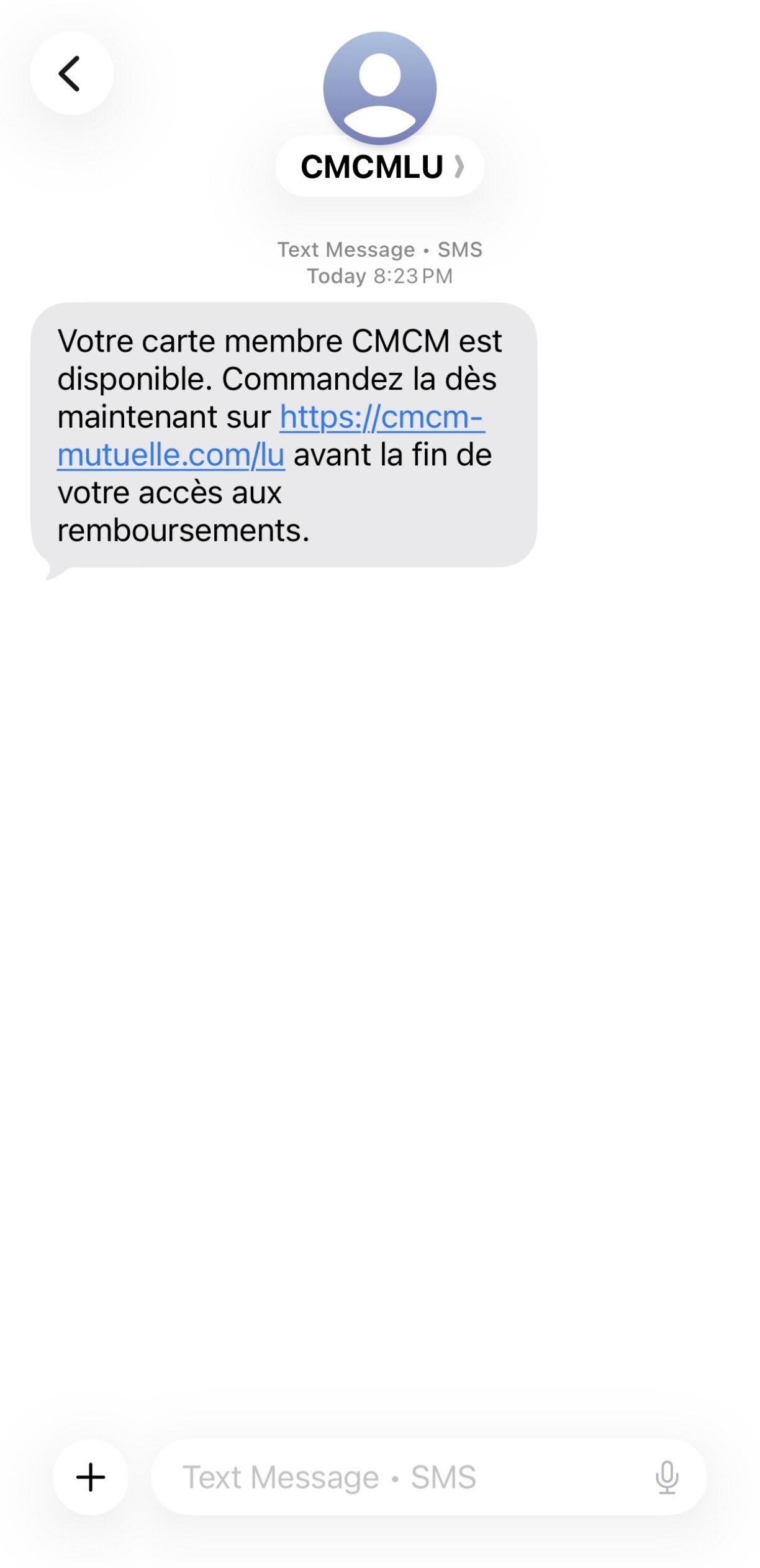 Wéi hei ënnen am Bild ze gesinn, geet an der SMS vun enger neier Memberskaart fir d’CMCM rieds, déi een iwwer een dubiéise Link bestelle kann. Fanger ewech!