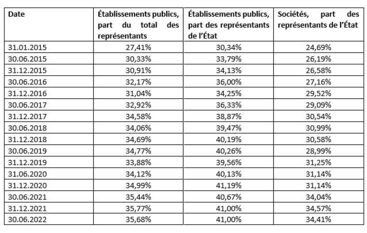 Au 30 juin 2022, le taux des femmes représentant l’État dans des conseils d’administration d’établissements publics était de 41% contre 40,67% il y a un an et 30,34% en date du 31 janvier 2015, soit une évolution de 10,33% sur 7,5 ans.