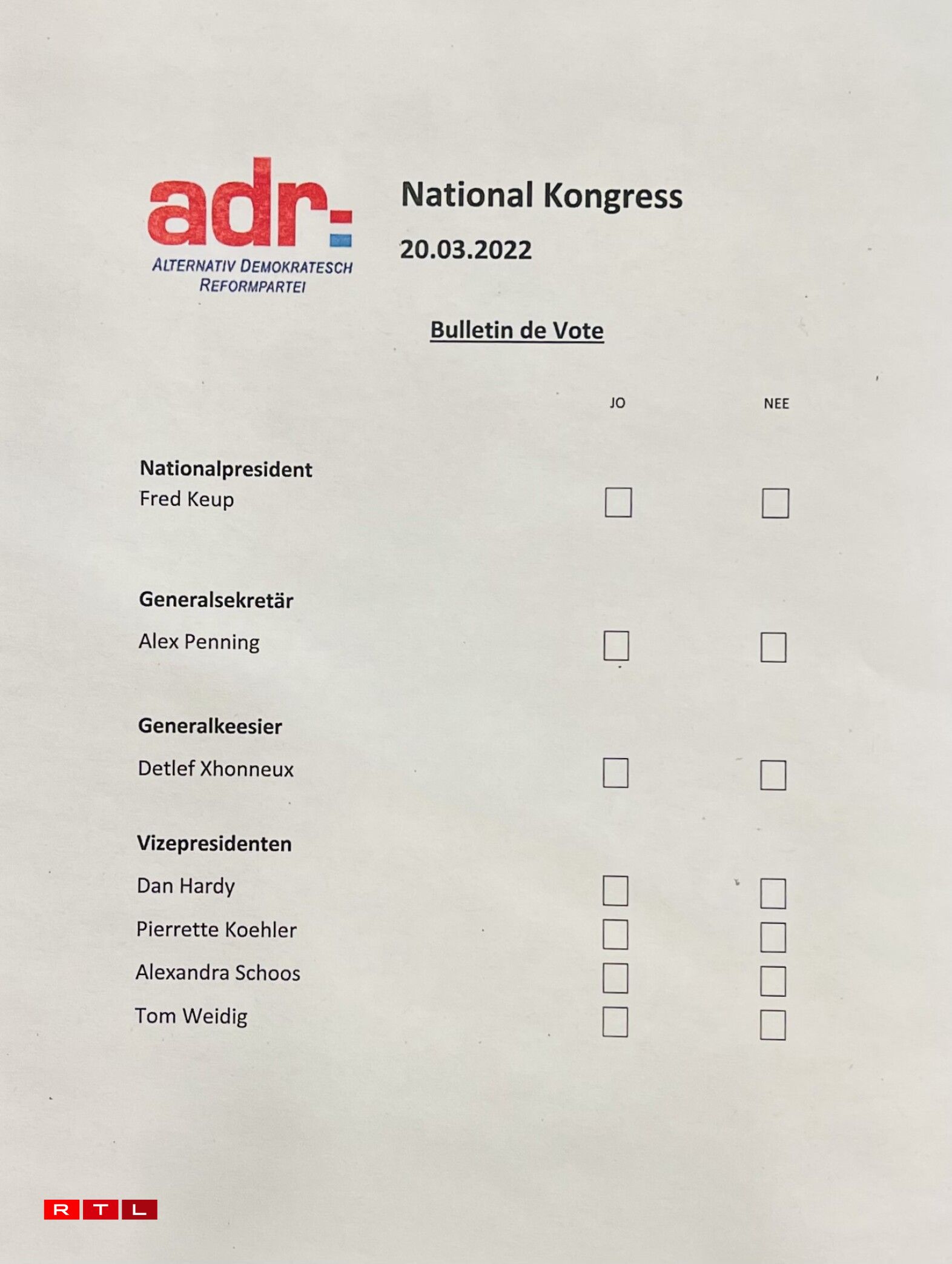 De Parteipresident Jean Schoos trëtt of, fir d’Relève huet sech de Fred Keup opgesat, deen am Moment Deputéierten an der Chamber ass. De Walprozess ass wéinst engem Feeler op de Stëmmziedelen zweemol duerchgefouert ginn. Den Deputéierte Fred Keup gouf mat 86 Jo-, 4 Nee-Stëmmen a 4 Enthalungen als neie Parteipresident vun der adr gewielt.