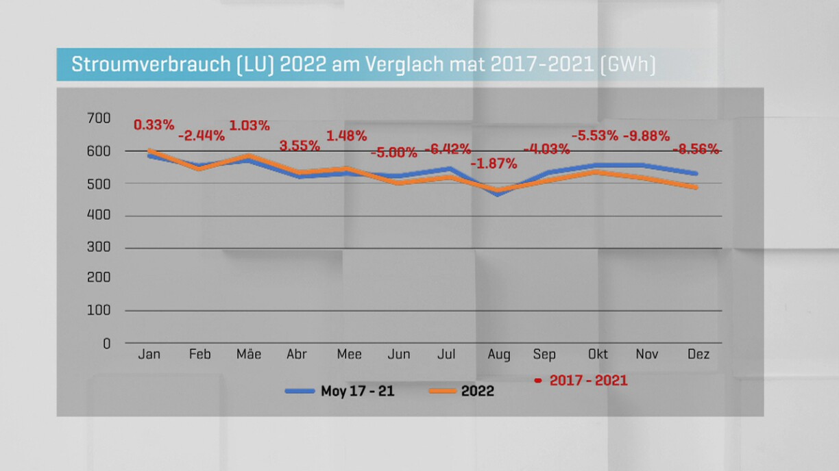 Den Energieministère huet d’Zuele vum Stroumverbrauch an de béiden Netzer, deem vu CREOS a vu SOTEL. D’Netz vu SOTEL versuergt d’Stolindustrie mat Stroum. Vergläicht een de Verbrauch vun de Méint am Joer 2022 mat deene vun de 5 Joer virdrun, dat heescht 2017 bis 2021, da stellt ee fir di zwee lescht Méint vum Joer eng gréisser Reduktioun am Stroumverbrauch fest. Am November 2022 sinn 9,88% manner elektresch Energie verbraucht gi wéi am Schnëtt di 5 Joer virdrun. Am Dezember 2022 8,56% manner.