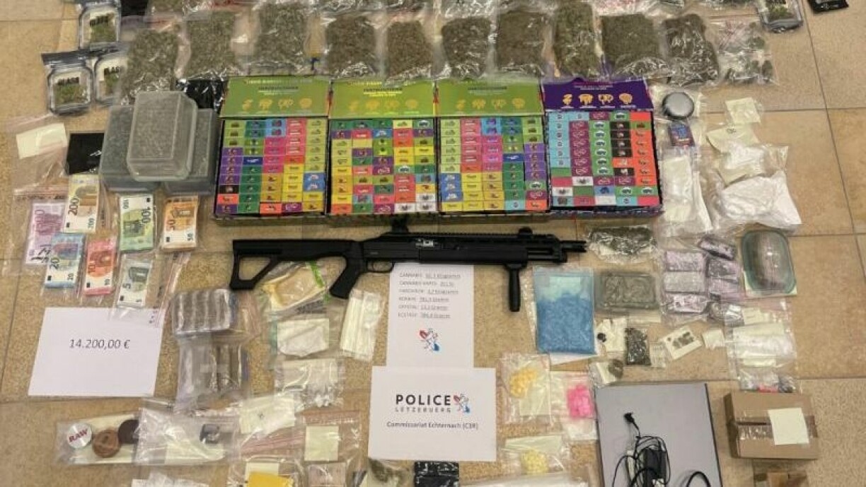 Et goufen iwwer 10 Kilo Cannabis séchergestallt, 800 Gramm Kokain, grad ewéi aner Drogen. Dobäi koumen nach eng Waff, Aueren, Drogenutensilien an iwwer 14.000 Euro Boergeld.