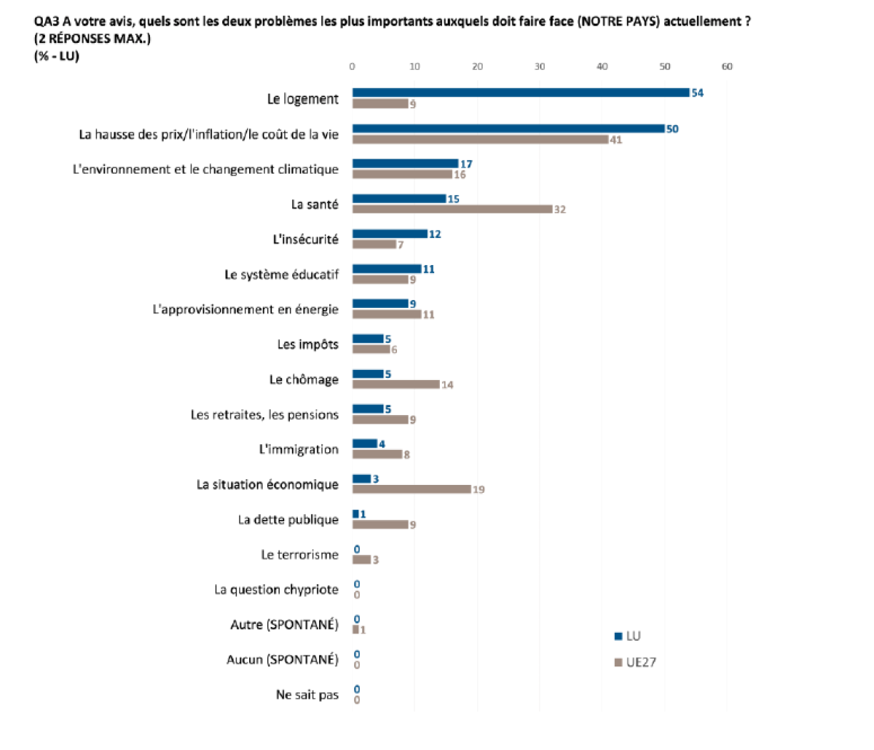 Déi zwou gréissten Erausfuerderunge si fir d’Lëtzebuerger Residenten de Logement an d’Inflatioun, dat huet de rezentsten Eurobarometer vum Wanter 2022 erginn. De Klimawandel huet et op Plaz 3 gepackt. Déi jonk Leit sinn awer am optimisteschsten, dass d’ekonomesch Situatioun sech an der EU verbessere wäert.
