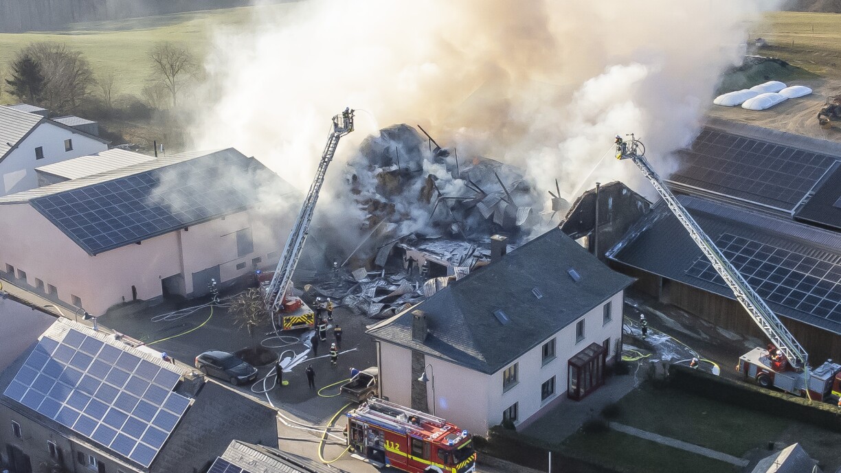 Wéi et op Nofro bei der Police heescht, hätt en Trakter, deen amgaange war, Aarbechten um Haff duerchzeféieren, an engem Stall Feier gefaangen. Eng Kou ass duerch de Brand gestuerwen, eng zweet huet missten ageschléifert ginn. Well am Stall och Botte gelagert waren, huet d’Feier séier eng gewësse Gréisst erreecht. Persoune koumen net zu Schued.
