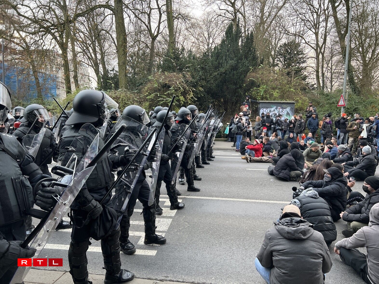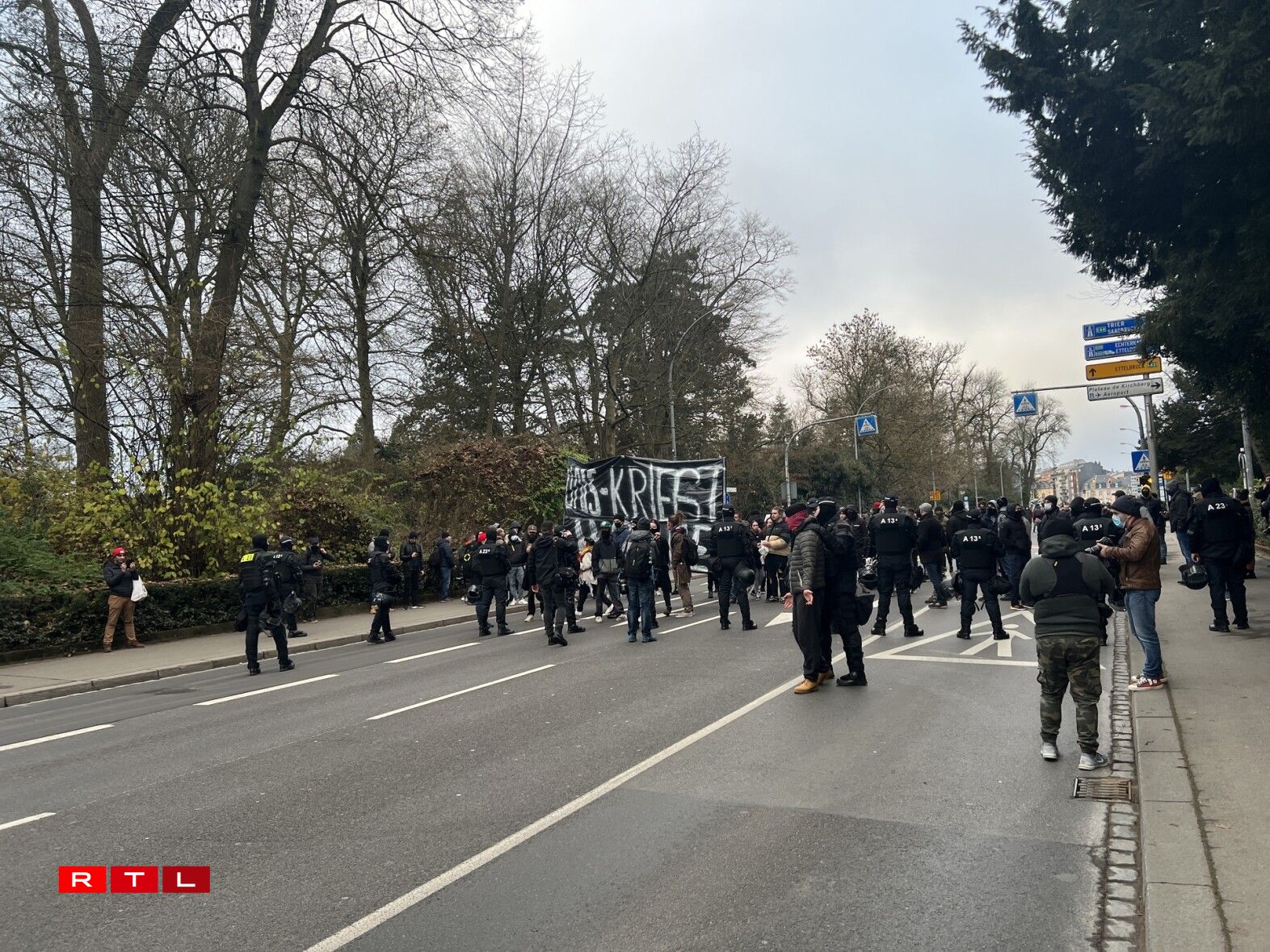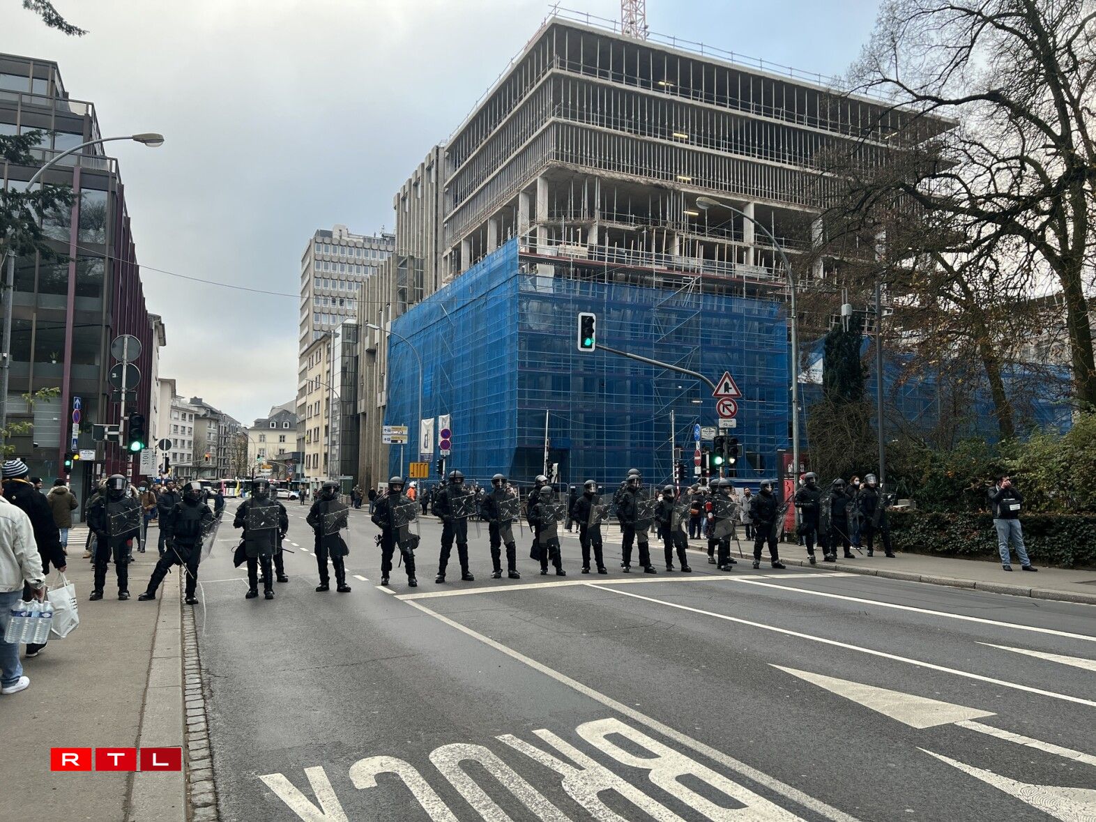 Eng ganz Partie Stroossen wéi och de Rond-point Schuman ware gespaart fir de Verkéier. D’Manifestanten, déi onerlaabt de Perimeter verlooss haten fir vum Glacis aus iwwer d’Avenue de la Porte-Neuve a Richtung Stadzentrum wollte goen, haten zu engem Ament e Sit-in gemaach, hu sech also virun d’Beamten an der Strooss op de Buedem gesat, nodeem dës si net passéiere gelooss hunn.