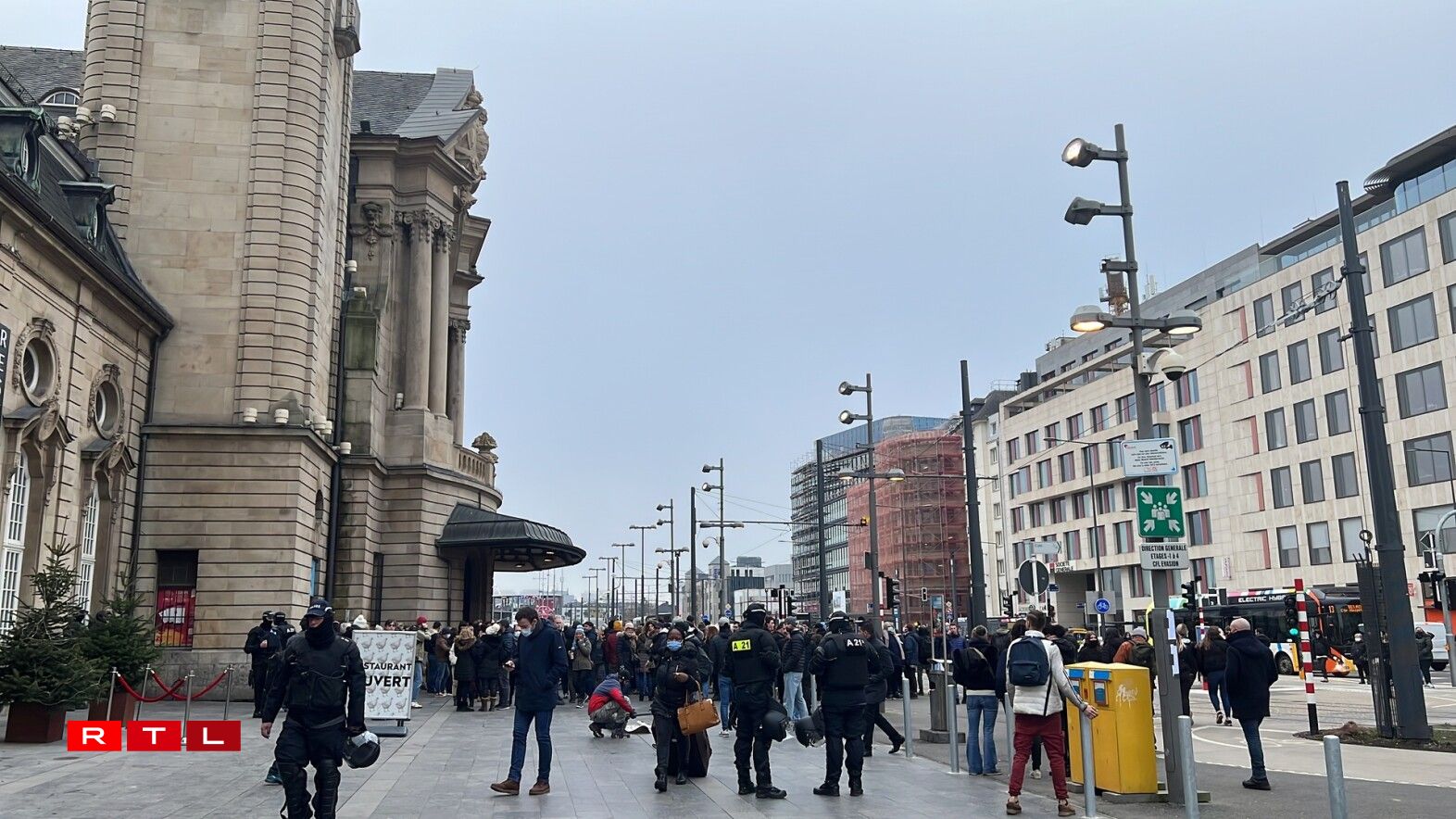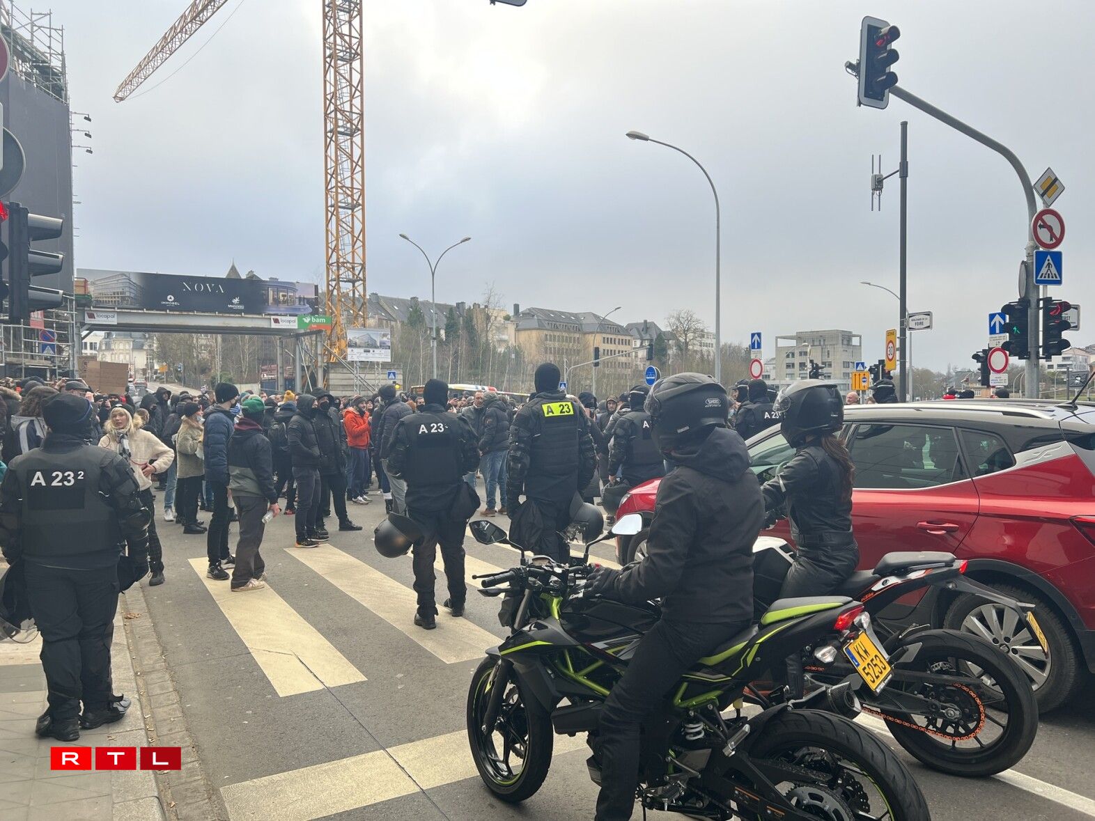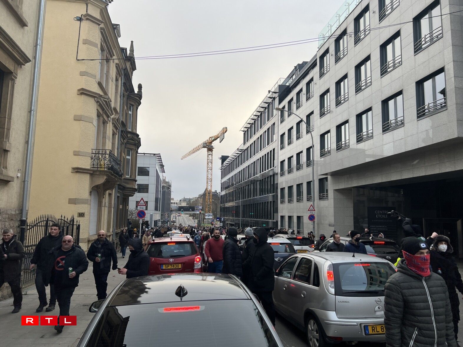 Eng ganz Partie Stroossen wéi och de Rond-point Schuman ware gespaart fir de Verkéier. D’Manifestanten, déi onerlaabt de Perimeter verlooss haten fir vum Glacis aus iwwer d’Avenue de la Porte-Neuve a Richtung Stadzentrum wollte goen, haten zu engem Ament e Sit-in gemaach, hu sech also virun d’Beamten an der Strooss op de Buedem gesat, nodeem dës si net passéiere gelooss hunn.