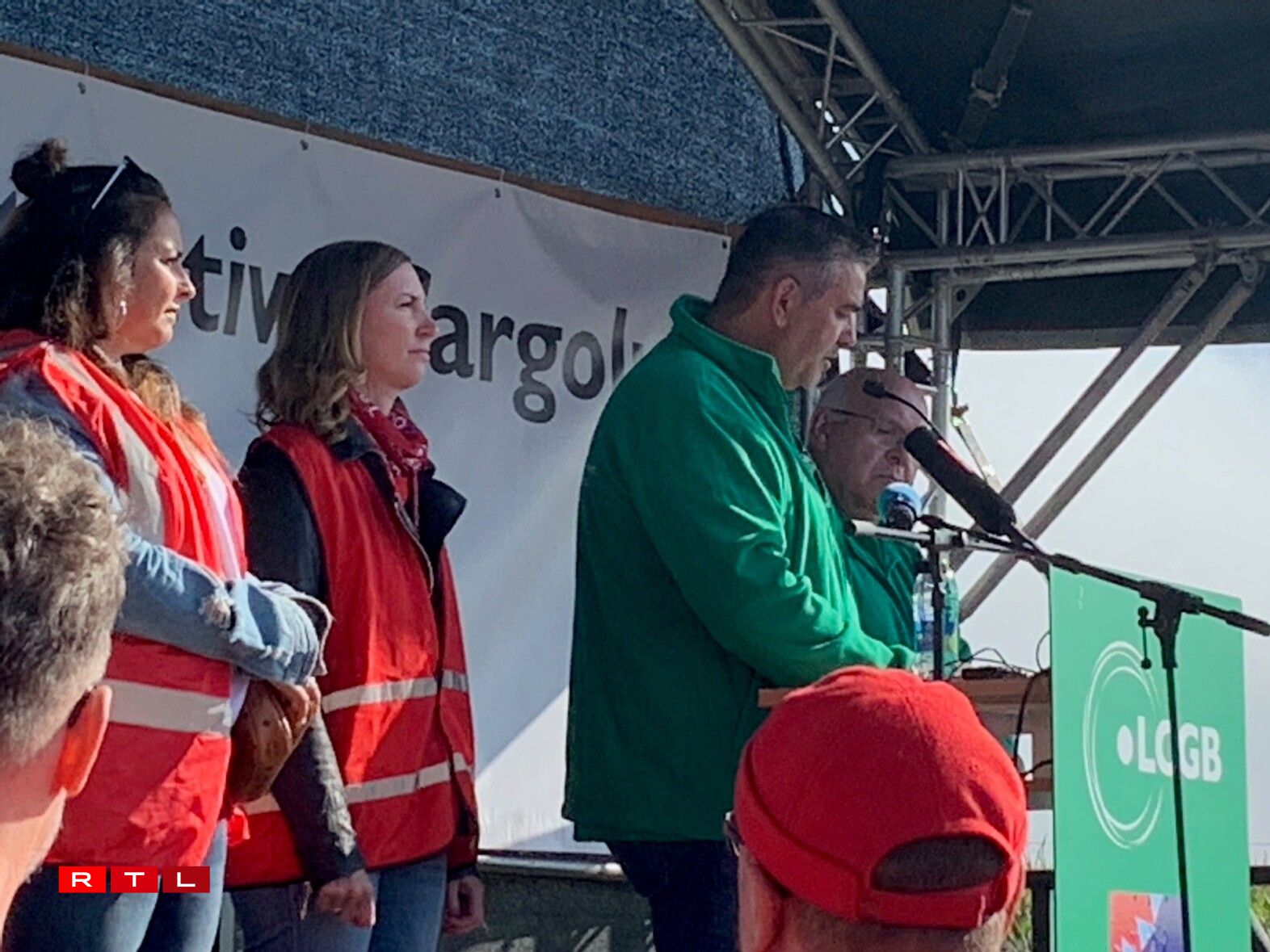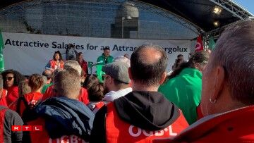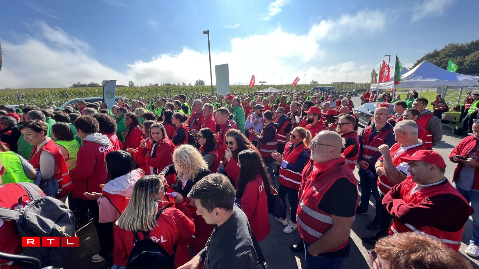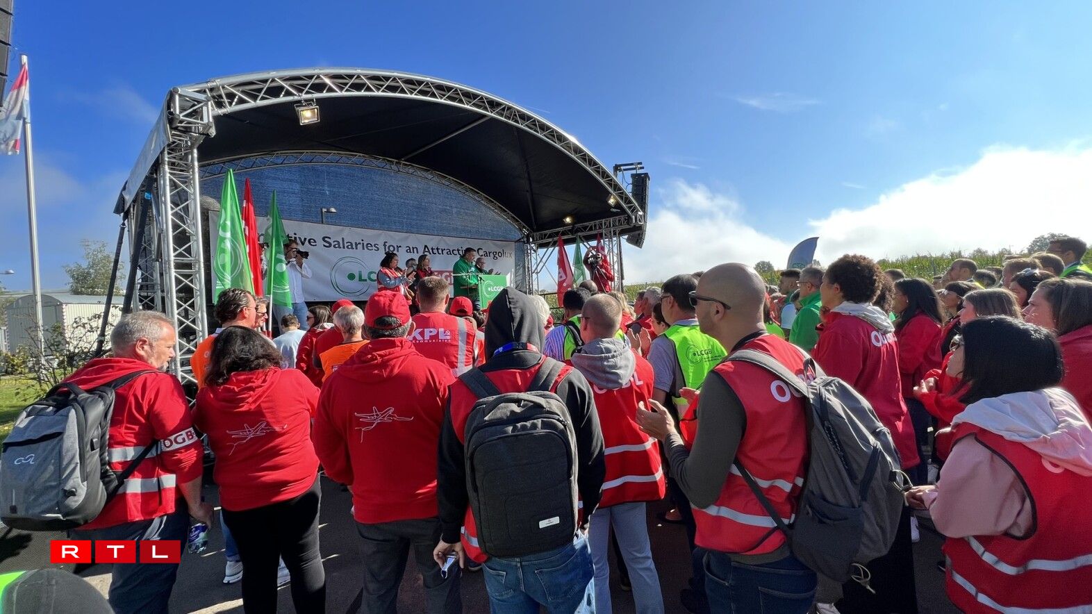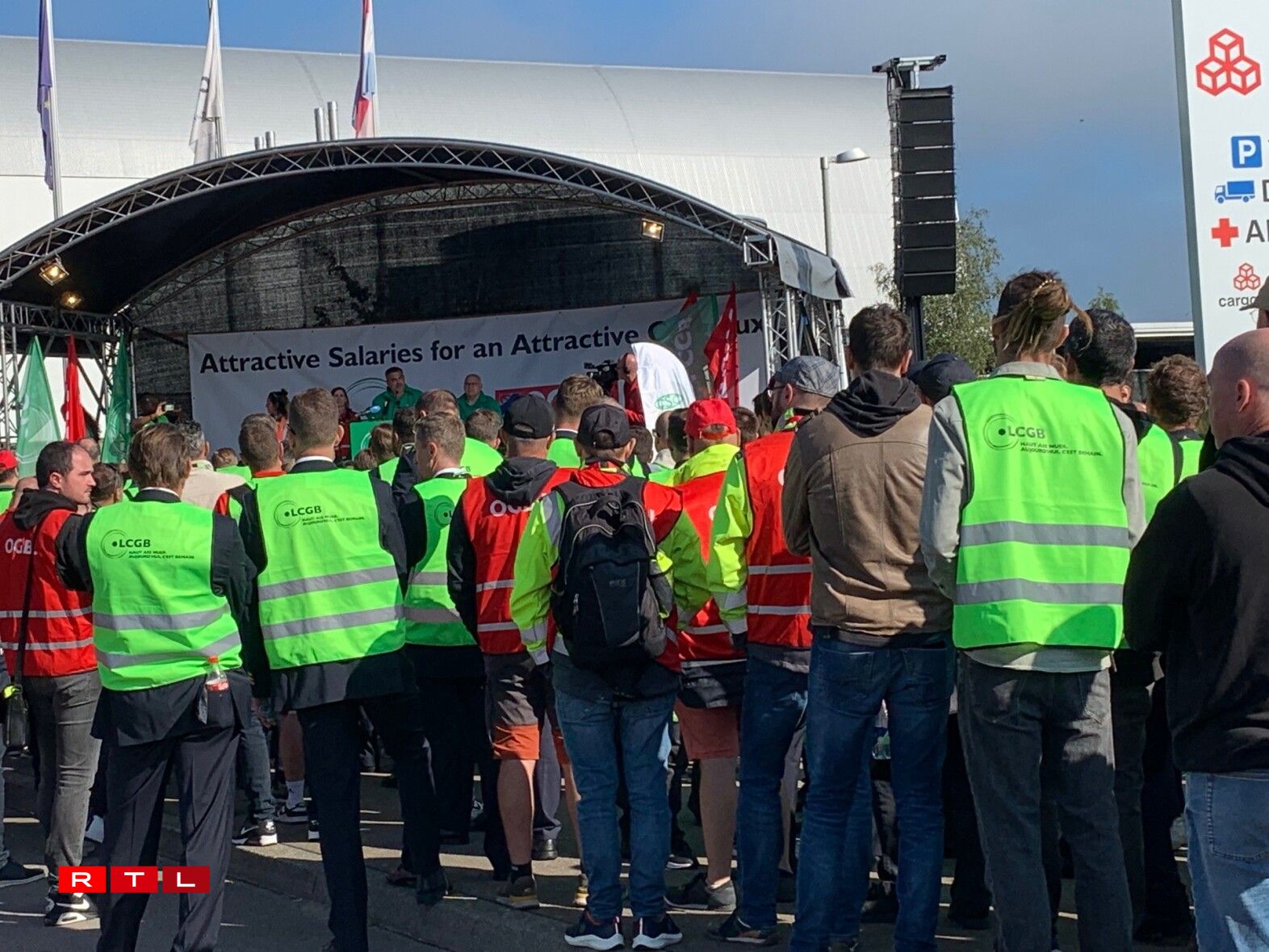 Virum Siège beim Rond-point Sandweiler huet d’Personal gewisen, dass een hannert de Gewerkschaften LCGB an OGBL steet. Et waren ëm déi 700 Leit virum Sëtz vun der Cargolux. Quasi paritéitesch mat grénge Gilete fir den LCGB, respektiv roude fir den OGBL.