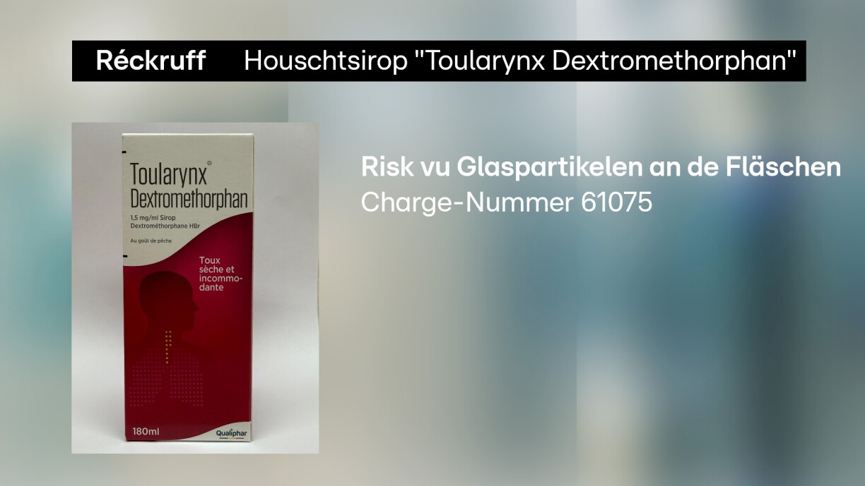 Wéi de Ministère fir Gesondheet a sozial Sécherheet mellt, rifft de Fabrikant Qualiphar virsiichtshallwer d’Charge N°61075 vum Houschtsirop “Toularynx Dextromethorphan 1,5 mg/ml” wéinst dem Risk vu Glaspartikelen zréck. An enger Fläsch aus där Charge wier nämlech e Stéck Glas dra gewiescht.