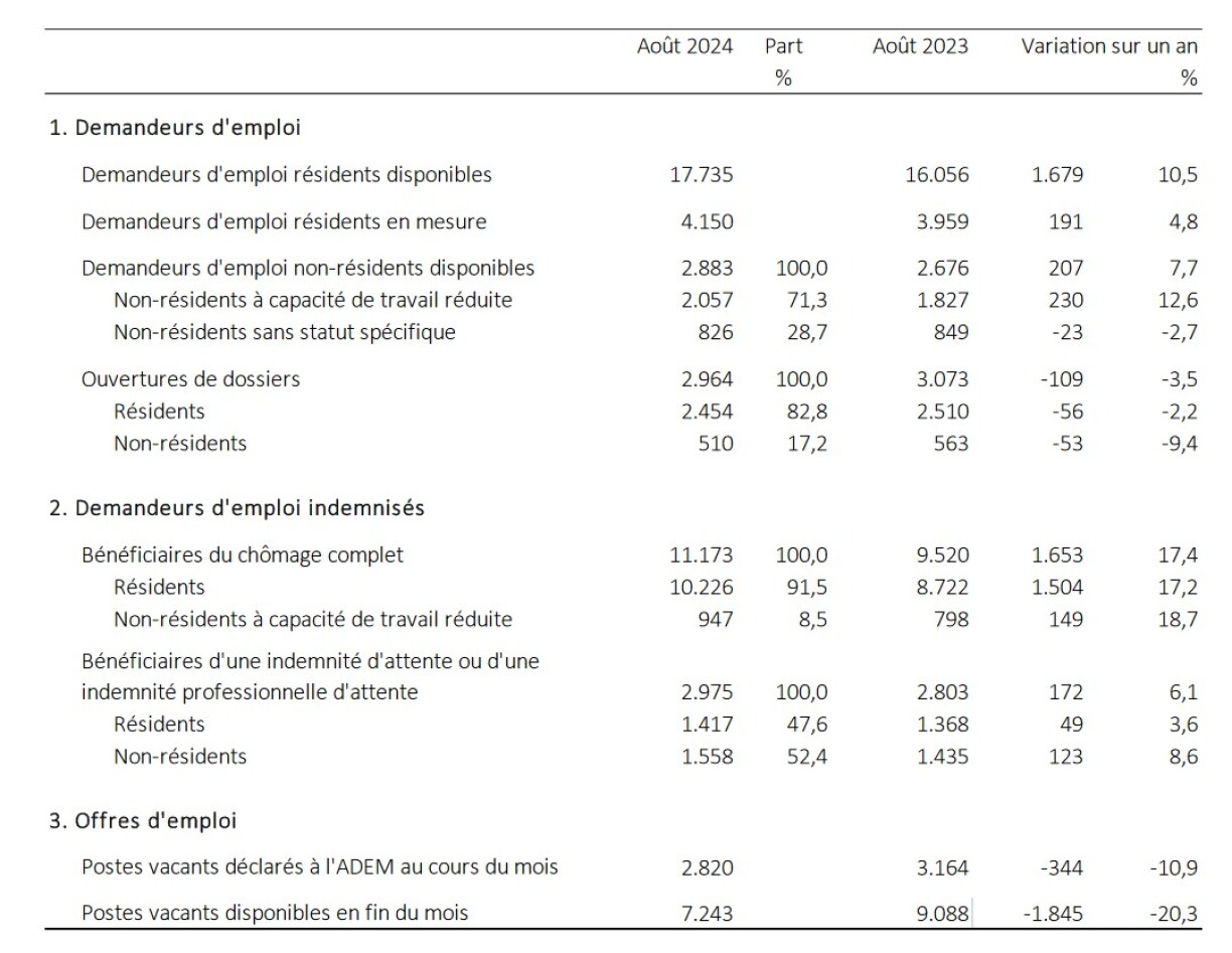 Op den 31. August 2024 ware 17.735 Aarbechtsloser bei der Adem ageschriwwen. Dat sinn eng 1.679 méi wéi nach 2023.