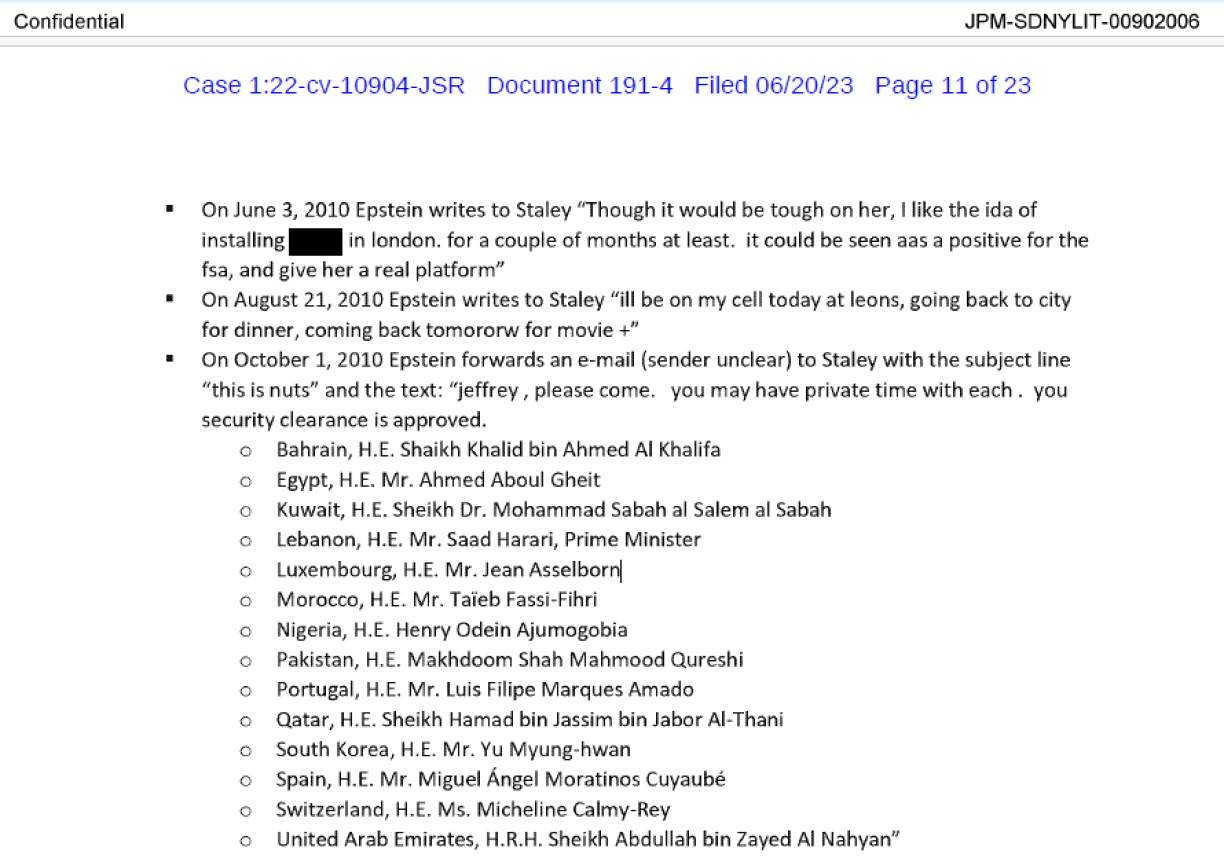 Den 1. Oktober 2010 huet de Banquier a Sexualverbriecher Jeffrey Epstein e Mail un de Banquier James “Jes” Staley weidergeschéckt, wou dra rieds ass, datt den Epstein de Lëtzebuerger Ausseminister an eng Rei vun aneren deemolege Vertrieder vun enger gudder Dose Staate kéint perséinlech treffen. Wien dem Epstein d’Mail geschéckt huet, ass net gewosst.