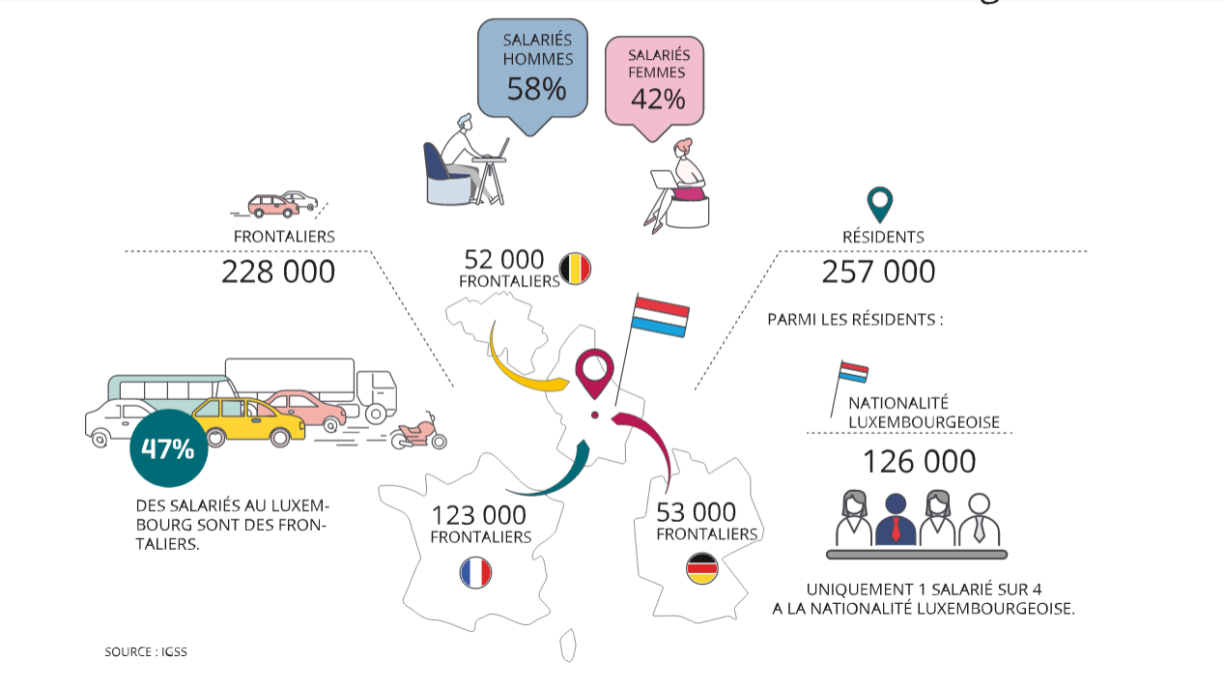 Am leschten Trimester zejoert hunn hei am Land 485.000 Salariéë geschafft, 47% dovunner ware Frontalieren. Méi wéi d’Hallschent vun deene Grenzgänger wunnt a Frankräich.