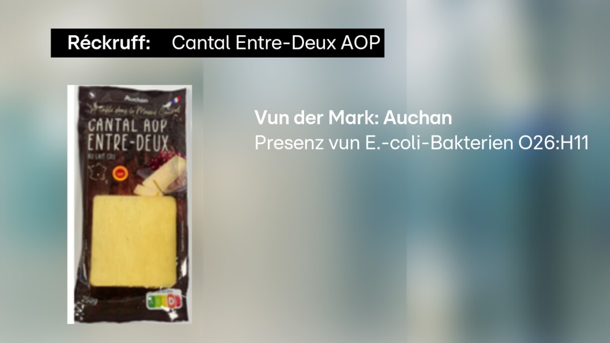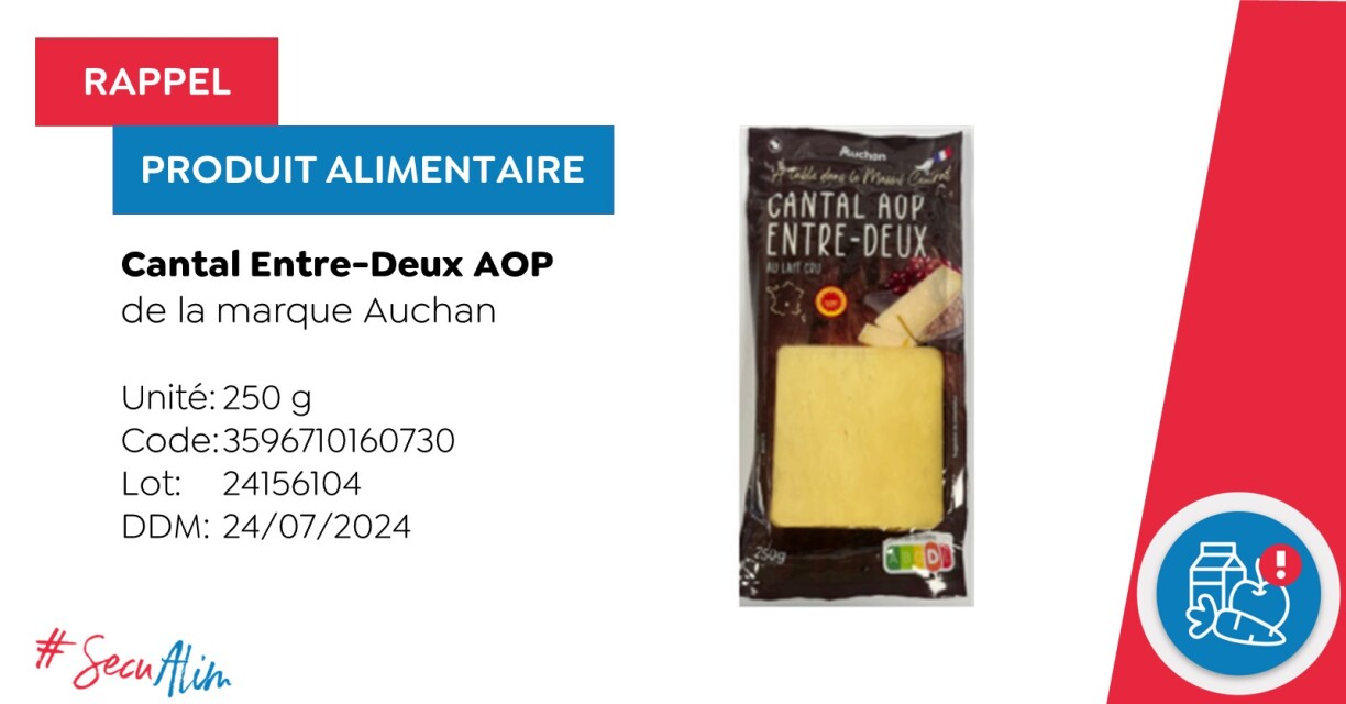 Leit, déi de Produit vum beschriwwenen Zäitraum consomméiert hunn, solle sech vun engem Dokter ënnersiche loossen an dësen iwwer d’Consommatioun informéieren. De Kéis Cantal Entre-Deux AOP gëtt och zu Lëtzebuerg an den Auchan-Supermarchéen verkaf.