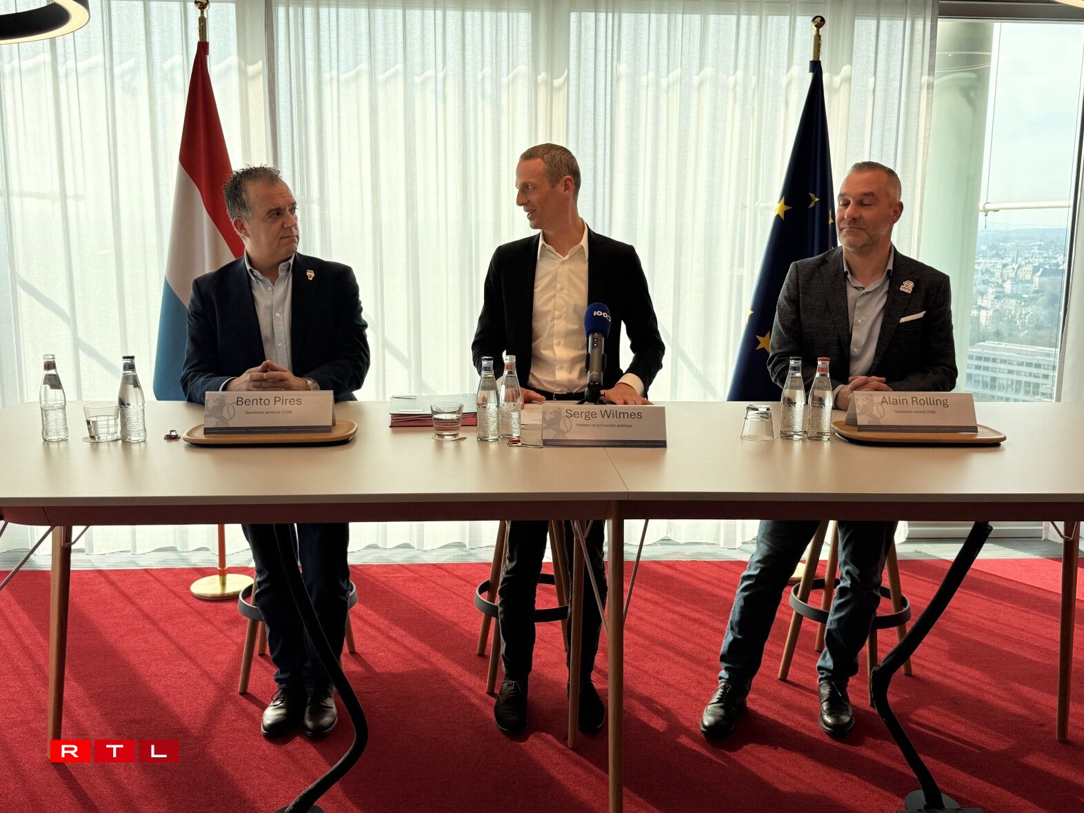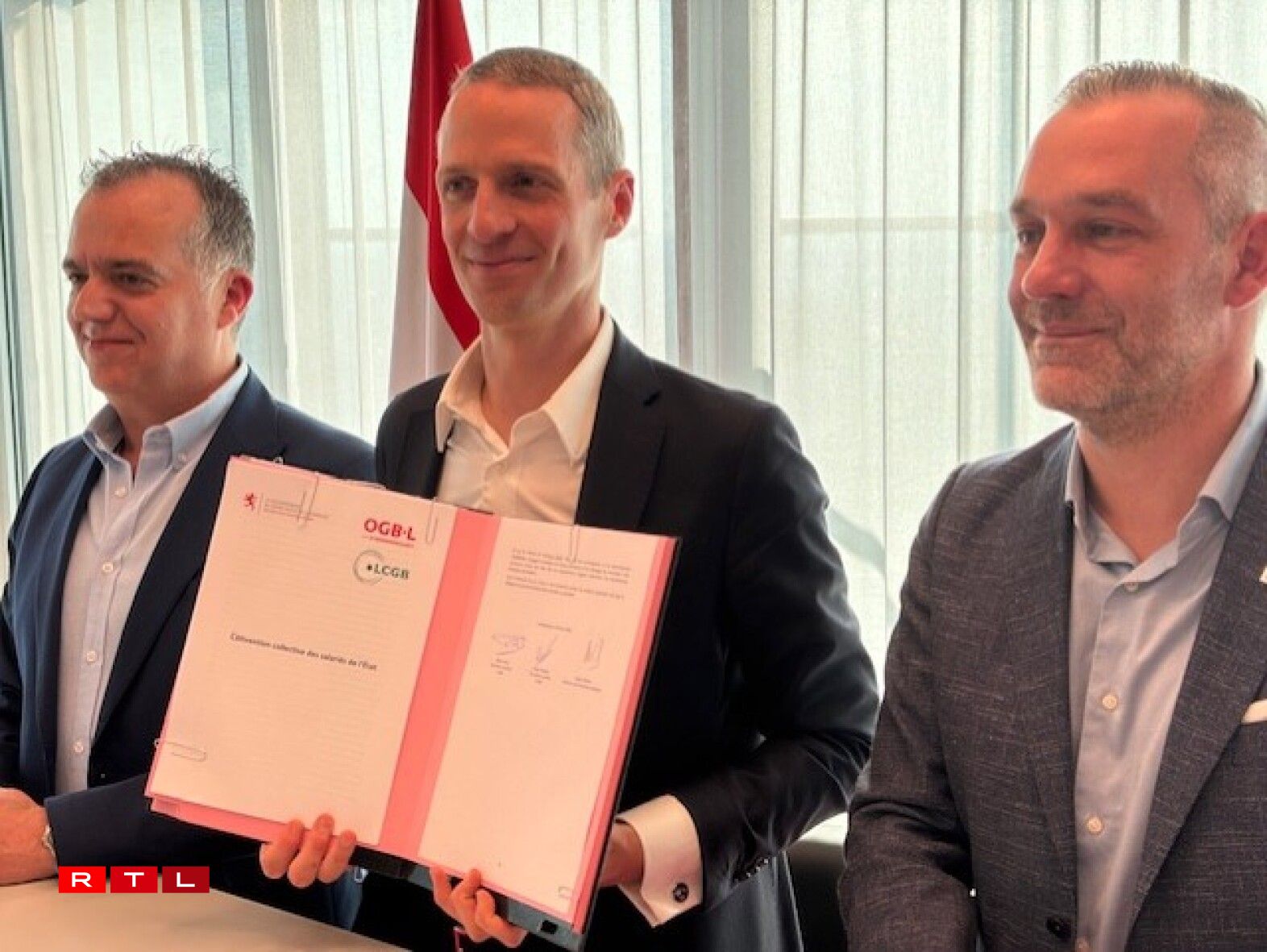 Der Minister für den öffentlichen Dienst, Serge Wilmes, der Zentralsekretär des OGBL, Alain Rolling, und der Gewerkschaftssekretär des LCGB, Bento Pires, haben am Donnerstagnachmittag den neuen Kollektivvertrag für Staatsbedienstete unterzeichnet und diesen anschließend den Medien vorgestellt.
