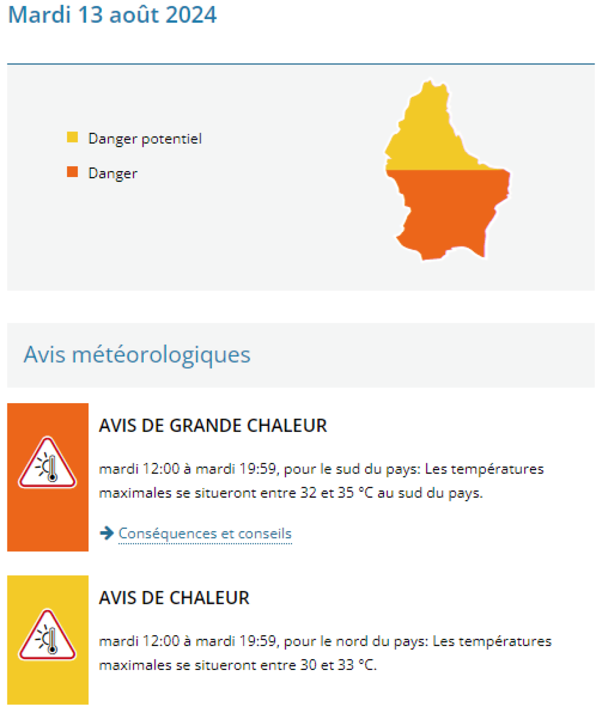 Laanscht d’Musel soll den Thermometer souguer nach doriwwer eraus klammen. Fir den Norde gëllt och eng alerte jaune. U Leit mat gesondheetleche Problemer a Senioren ass et wéi gewinnt den Opruff sech net ze laang an der praller Sonn opzehalen, a kierperlech Aktivitéiten besser de Moien ze maachen, oder eréischt wann d’Sonn ënner ass.