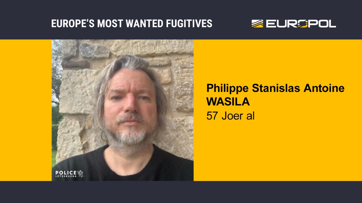 Wien Informatiounen iwwert de Philippe Stanislas Antoine Wasila huet, soll sech bei FAST Luxembourg (fast.lux@police.etat.lu) oder iwwert de Site vun Europol (www.eumostwanted.eu) mellen.