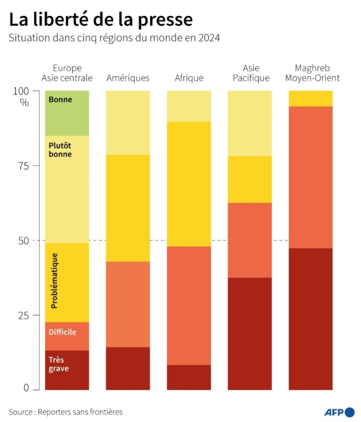 An 36 Länner gëtt d’Lag vun der Pressefräiheet dann als “ganz eescht” klasséiert, wat heescht, dass do eng onofhängeg journalistesch Aarbecht praktesch net méiglech wier. An de Statistike vu Reporter ouni Grenze sinn dat esou vill Länner, wéi zanter 10 Joer net méi.