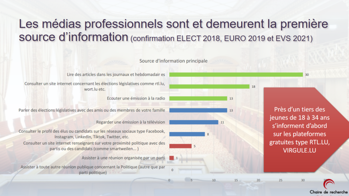 “Les médias professionels, presse écrite ou presse en ligne, vous-mêmes la radio ou la télévision étaitent toujours majoritaire au Luxembourg. Beaucoup plus que les réseaux sociaux. Bien entendu la part des réseaux sociaux a un petit peu augmenté, mais c’est toujours très majoritaire. Et le premier média professionel, c’est la radio.”