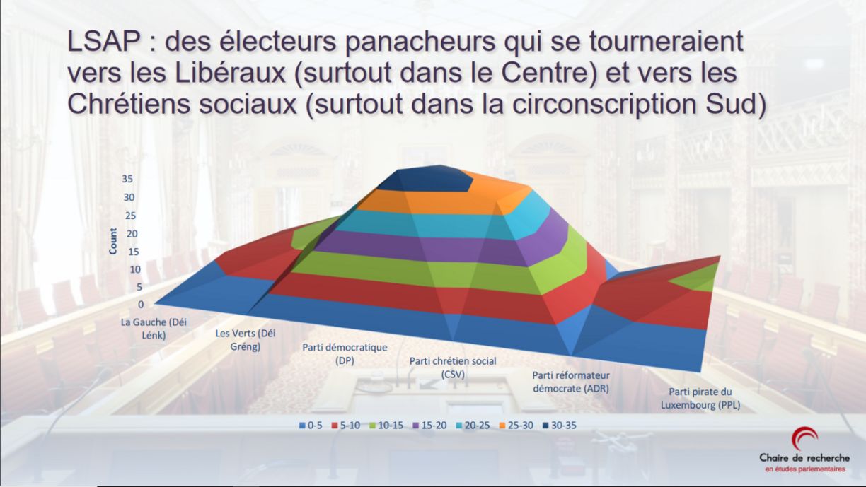 Wat d’Präferenze fir aner Parteien ubelaangt, esou zitt et beispillsweis d’Unhänger vun deene Gréngen, déi panachéieren, tëscht 40 a 50 Prozent bei d’LSAP, d’DP an d’CSV. Déi sozialistesch Panacheuren zitt et am Zentrum bei déi Liberal an am Süde bei déi Chrëschtsozial.